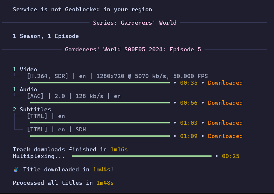 (venv) F:\devine>devine dl -q 720 iP https://www.bbc.co.uk/iplayer/episode/m001y5pf/gardeners-world-2024-episode-5