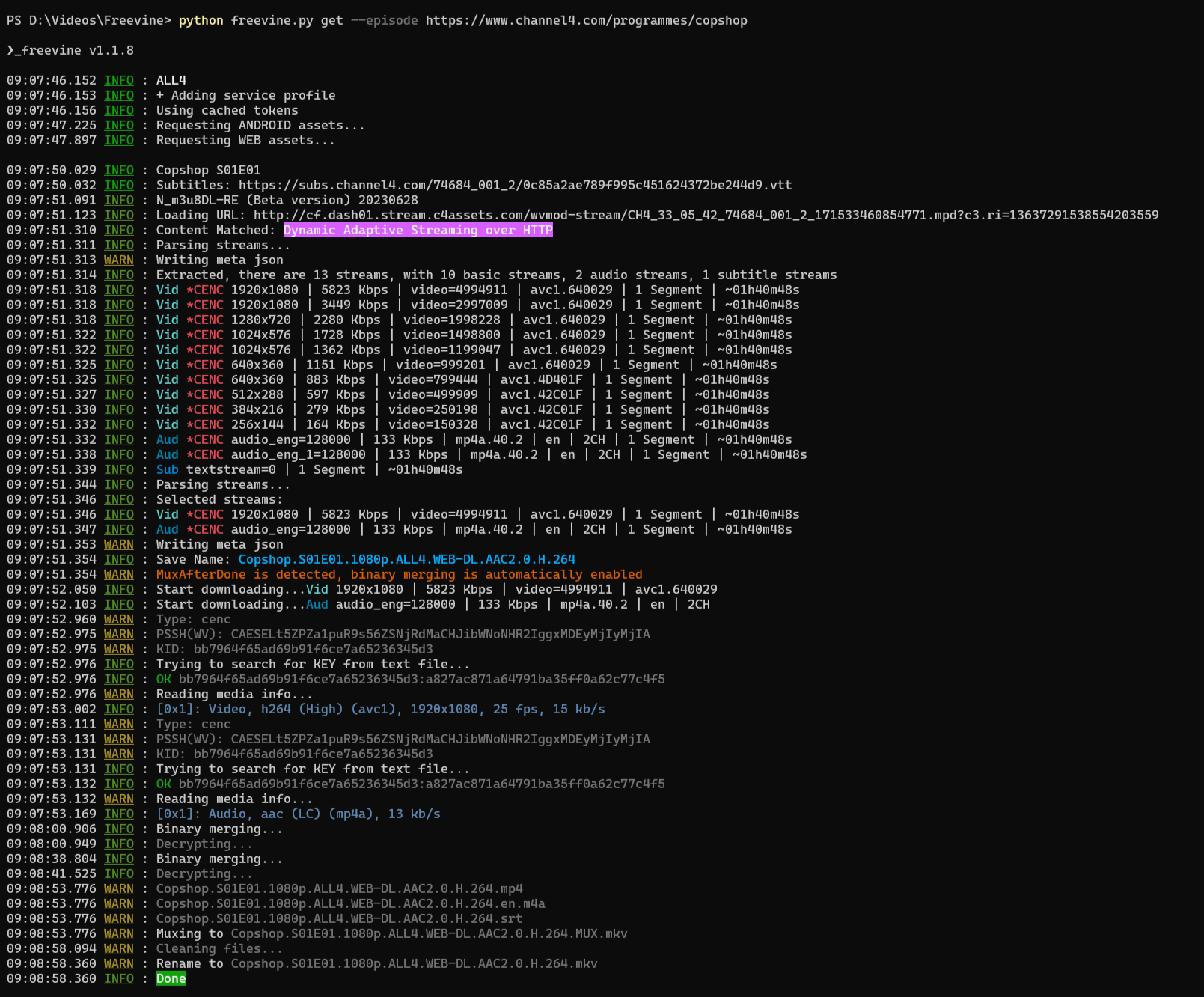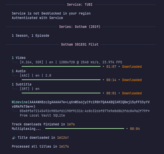Code:(env) PS C:\Users\user\git\freevine> py freevine.py get -s01e47 https://pluto.tv/us/on-demand/series/5f9c8b33b7f0da001afa75c8/ ❯_freevine v1.1.8 INFO : PlutoTV INFO : Los herederos del monte: 1 Season(s), 128 Episode(s) INFO : Los herederos del monte S01E47 Verdad dolorosa INFO : N_m3u8DL-RE (Beta version) 20231113 INFO : Loading URL: http://silo-hybrik.pluto.tv.s3.amazonaws.com/d7809d_Telemundo/clip/5f9c8b37b7f0da001afa763a_Los_Herederos_Del_Monte_LAS_Verdad_dolorosa_S1E47/720p/20201103_153411/hls/0-end/master.m3u8 INFO : Content Matched: HTTP Live Streaming INFO : Parsing streams... WARN : Master List detected, try parse all streams WARN : Writing meta json INFO : Extracted, there are 6 streams, with 5 basic streams, 0 audio streams, 1 subtitle streams INFO : Vid 1280x720 | 2564 Kbps | 30 | avc1.64001f,mp4a.40.2 INFO : Vid 854x480 | 1756 Kbps | 30 | avc1.64001f,mp4a.40.2 INFO : Vid 854x480 | 1146 Kbps | 30 | avc1.64001f,mp4a.40.2 INFO : Vid 640x360 | 741 Kbps | 30 | avc1.64001f,mp4a.40.2 INFO : Vid 426x240 | 437 Kbps | 30 | avc1.64001f,mp4a.40.2 INFO : Sub subs | es | Spanish INFO : Parsing streams... INFO : Selected streams: INFO : Vid *AES_128 1280x720 | 2564 Kbps | 30 | avc1.64001f,mp4a.40.2 | 535 Segments | ~44m31s INFO : Sub subs | es | Spanish | 535 Segments | ~44m31s WARN : Writing meta json INFO : Save Name: Los.herederos.del.monte.S01E47.Verdad.dolorosa.720p.PLUTO.WEB-DL.AAC2.0.H.264 WARN : MuxAfterDone is detected, binary merging is automatically enabled INFO : Start downloading...Sub subs | es | Spanish INFO : Start downloading...Vid 1280x720 | 2564 Kbps | 30 | avc1.64001f,mp4a.40.2 WARN : Reading media info... INFO : NaN: Subtitle, webvtt WARN : Reading media info... INFO : [0x100]: Video, h264 (High) ([27][0][0][0]), 1280x720, 30 fps INFO : [0x101]: Audio, aac (LC) ([15][0][0][0]), 97 kb/s WARN : Extracting VTT(raw) subtitle... INFO : Binary merging... INFO : Binary merging... WARN : Los.herederos.del.monte.S01E47.Verdad.dolorosa.720p.PLUTO.WEB-DL.AAC2.0.H.264.ts WARN : Los.herederos.del.monte.S01E47.Verdad.dolorosa.720p.PLUTO.WEB-DL.AAC2.0.H.264.es.srt WARN : Muxing to Los.herederos.del.monte.S01E47.Verdad.dolorosa.720p.PLUTO.WEB-DL.AAC2.0.H.264.MUX.mp4 WARN : Cleaning files... WARN : Rename to Los.herederos.del.monte.S01E47.Verdad.dolorosa.720p.PLUTO.WEB-DL.AAC2.0.H.264.mp4 INFO : Done