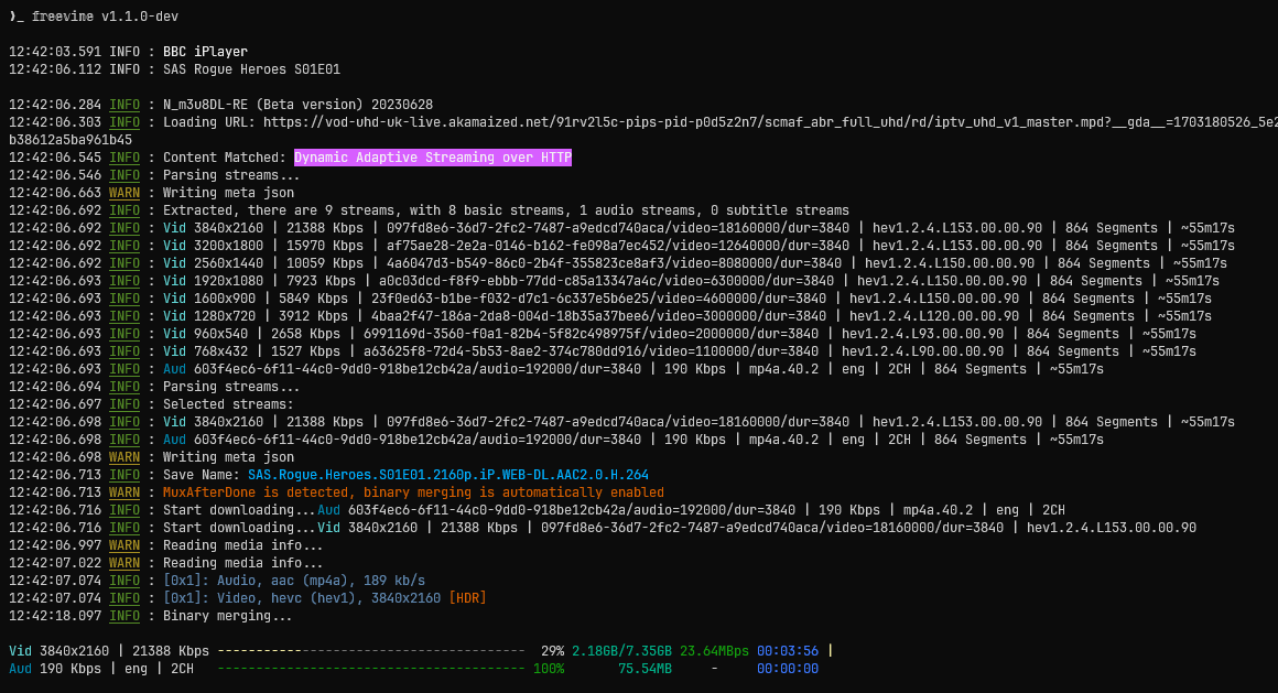 10:39:48.385 INFO : Vid *CENC 1920x1080 | 6000 Kbps | 1 | 25 | avc1.640028 | 1 Segment | ~45m05s