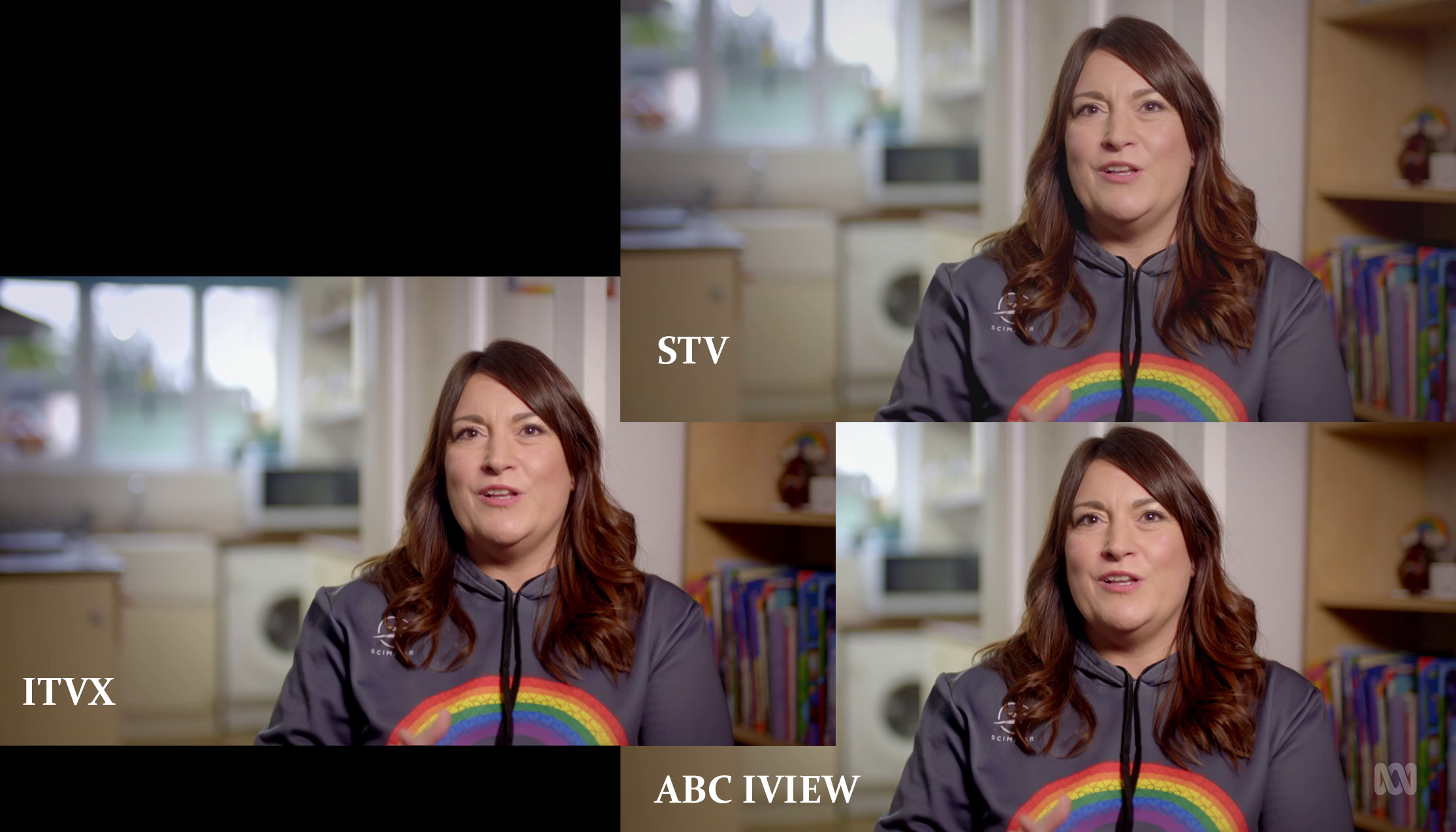 Check this composite image for comparison. Exact same frame from ITVx video, STV one, and ABC IView. The color is off on the STV one