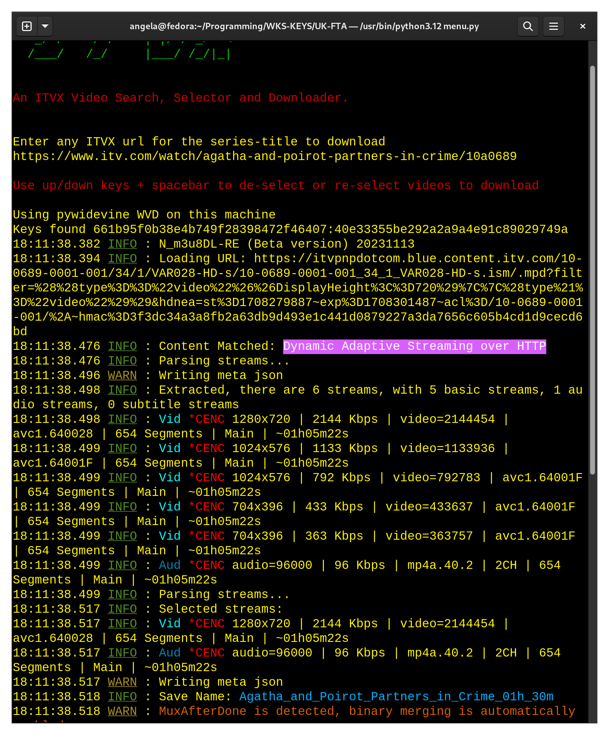 For some reason for thuis url (https://www.itv.com/watch/agatha-and-poirot-partners-in-crime/10a0689) it is important to run ITVX.py as a surrogate. So be sure to call itv_loader.py and feed that with your itv link url.Code:def get_data(self, url: str) -> tuple: spinner = Spinner(DOTS) spinner.start() headers={ 'authority': 'www.itv.com', 'user-agent': 'Dalvik/2.9.8 (Linux; U; Android 9.9.2; ALE-L94 Build/NJHGGF)', } r = self.client.get(url, headers=headers, follow_redirects=True) if r.status_code == 200: tree = LexborHTMLParser(r.text) jsondata = tree.root.css_first('#__NEXT_DATA__').text() myjson = json.loads(jsondata) extendtitle = '' # may not be assigned below myjson =myjson['props']['pageProps'] title = jmespath.search("programme.title", myjson) title = title.replace(' ', '_') try: extendtitle = jmespath.search('episode.contentInfo', myjson).replace('.','').replace(',','') except: extendtitle = '' pass magni_url = jmespath.search('[ seriesList.[*].titles.[*].playlistUrl , episode.playlistUrl]', myjson) magni_url = (next (item for item in magni_url if item is not None)) features = ['mpeg-dash', 'widevine', 'outband-webvtt', 'hd', 'single-track'] payload = { 'client': {'id': 'browser'}, 'variantAvailability': { 'featureset': {'min': features, 'max': features}, 'platformTag': 'dotcom', } } r = self.client.post(magni_url, json=payload) spinner.stop() return title, extendtitle, r.json() else: print(f"The response code {r.status_code} did not indicate successs!") print(f"The web page content returned was:-\n\n {r.content}\n\nExiting!") print(f"Be sure to copy a page url for a playable video ") exit(1)Last edited by A_n_g_e_l_a; 18th Feb 2024 at 16:21.