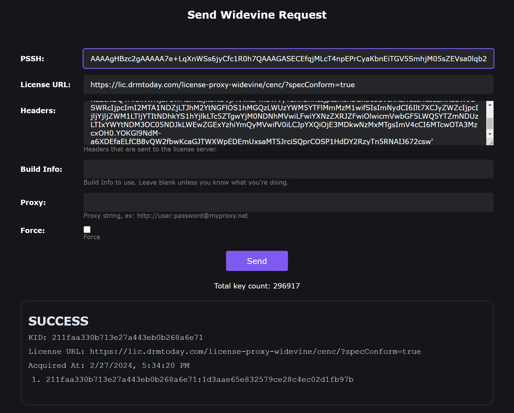 I tried again today with another file, and it definitely works. Same method as in my previous post, just have to include the x-dt-auth-token value found in the license post in dev tools when running through the CDM.