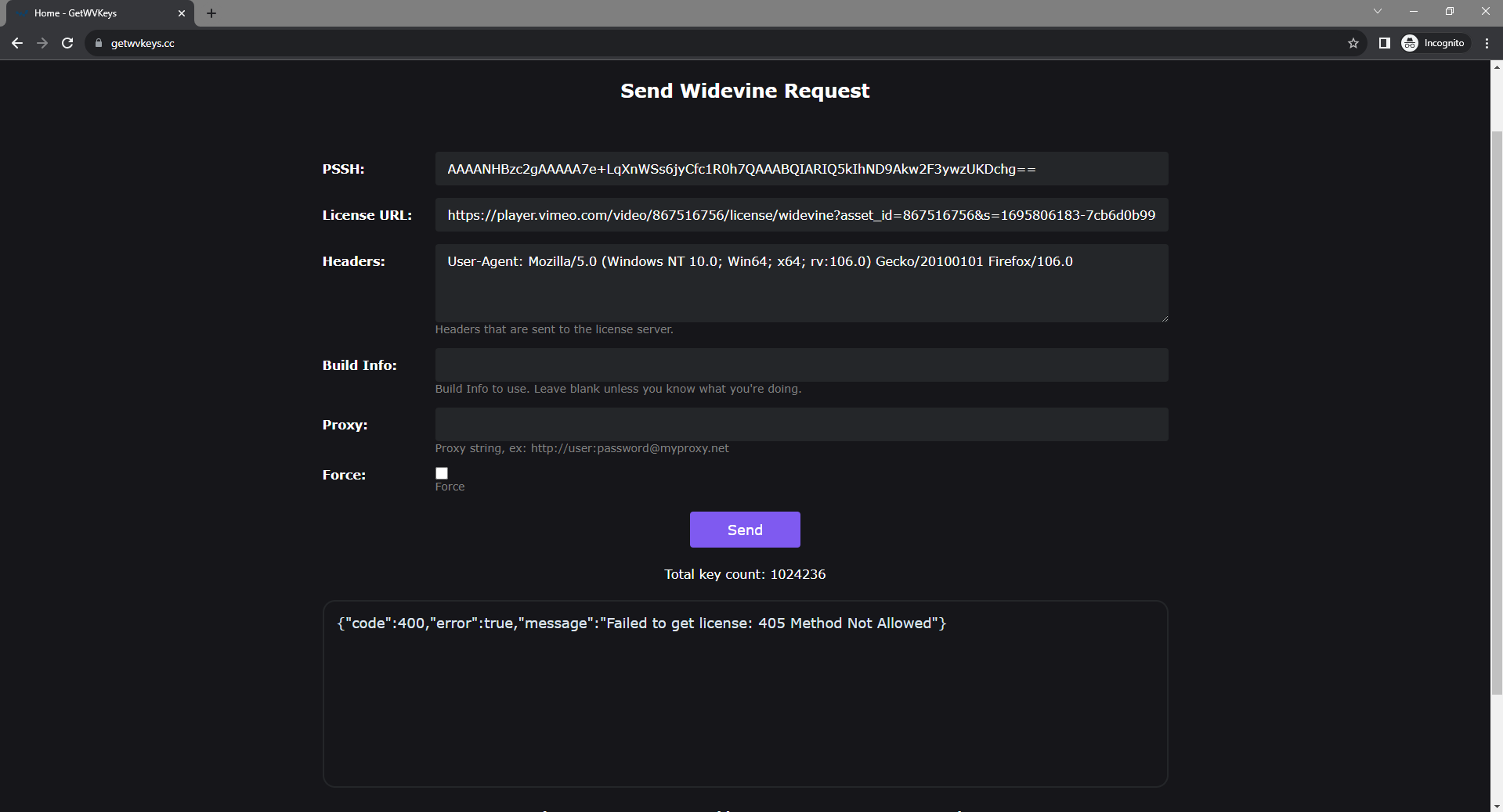"code":400,"error":true,"message" on http://getwvkeys.cc