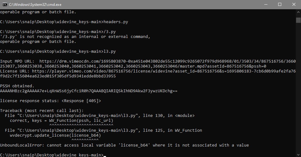 Hey! I am trying to download a video, but I get this error: {"code":400,"error":true,"message":"Failed to get license: 405 Method Not Allowed"} and I don't know hat to do. Visuals: