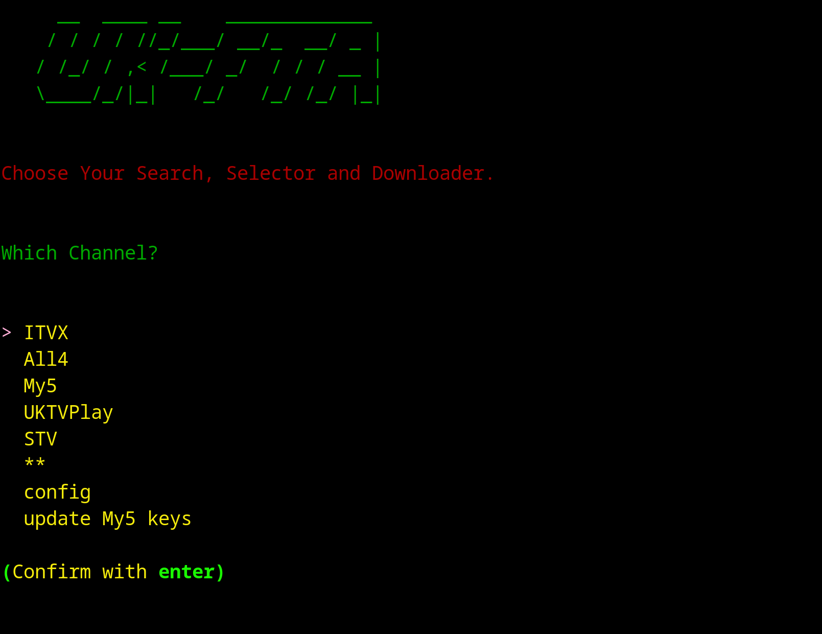 I am running the script from a windows machine.Code:Search word(s)? Irish Journey [info] getting data for https://www.channel4.com/programmes/julia-bradburys-irish-journey Use up/down keys + spacebar to de-select or re-select videos to download [?] 1 1 https://www.channel4.com/programmes/julia-bradburys-irish-journey/on-demand/74774-001 [?] 1 2 https://www.channel4.com/programmes/julia-bradburys-irish-journey/on-demand/74774-002 [?] 1 3 https://www.channel4.com/programmes/julia-bradburys-irish-journey/on-demand/74774-003 [?] 1 4 https://www.channel4.com/programmes/julia-bradburys-irish-journey/on-demand/74774-004