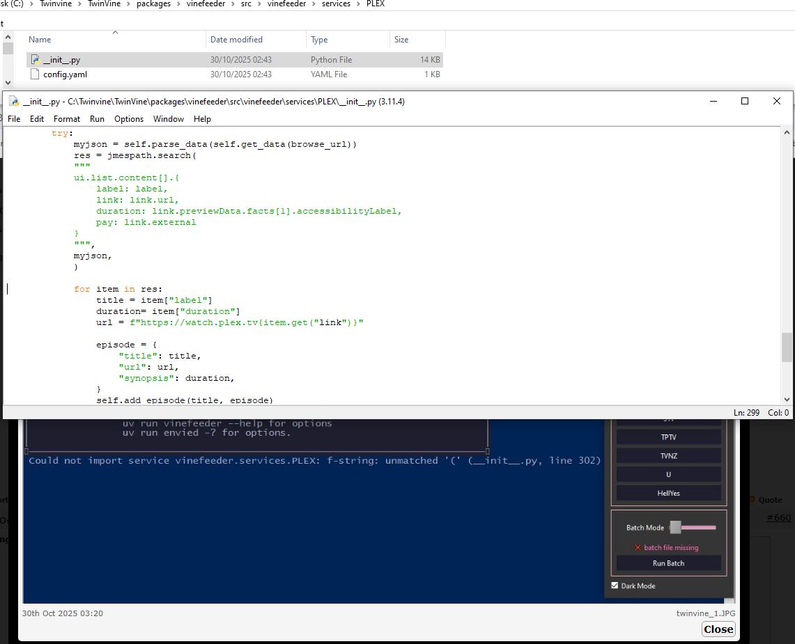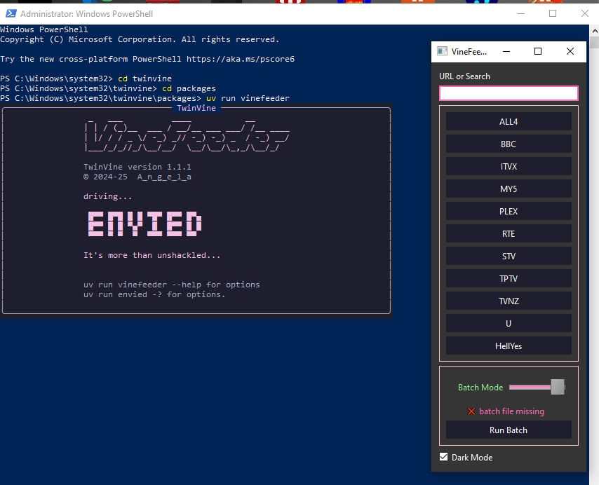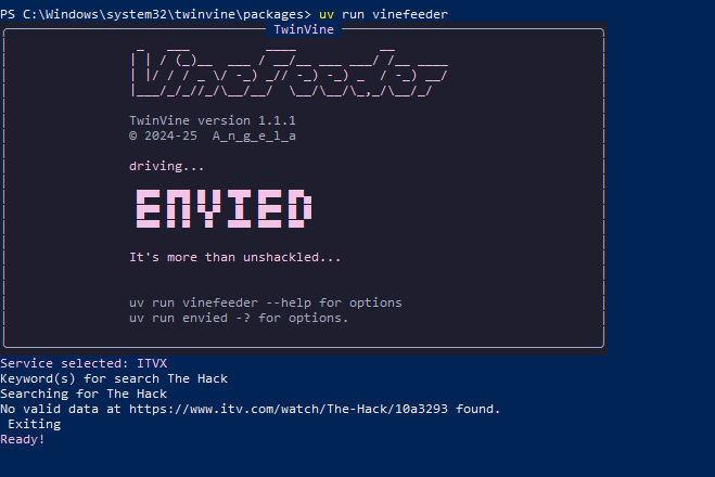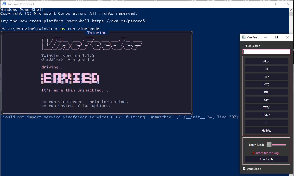 I thought I would go with the flow and try and keep up with the latest and greatest. installing twinvine was okay. created a folder on my C drive called Twinvine, and ran your instructions from the cmd prompt. oddly it made another twinvine folder inside. but I can deal with that later. I edited my yaml to add 4od email and password. but (there's always a but) when i ran uv run vinefeeder from powershell i had an unusual error appear. Hoping you could explain what it may mean. please see image: