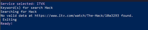 However when I select one - in this case the first option - I get "No valid data at https://www.itv.com/watch/Coronation-Street/1a0694 found"