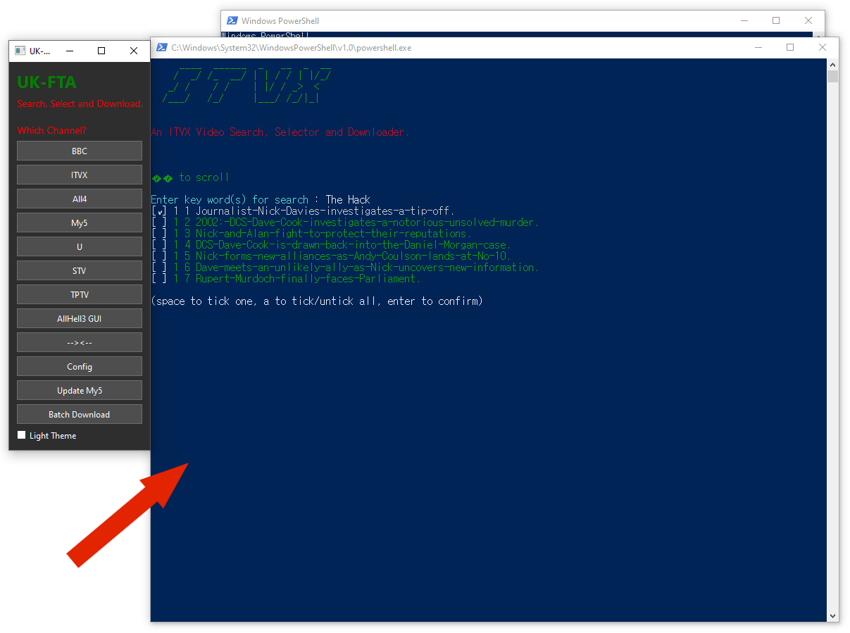 The PowerShell window I mean is as shown below – this window opens after clicking on a channel in the GUI. After it crashes only the GUI is displayed along with the original PowerShell window from where I ran the python gui.py command to start UK-FTA.