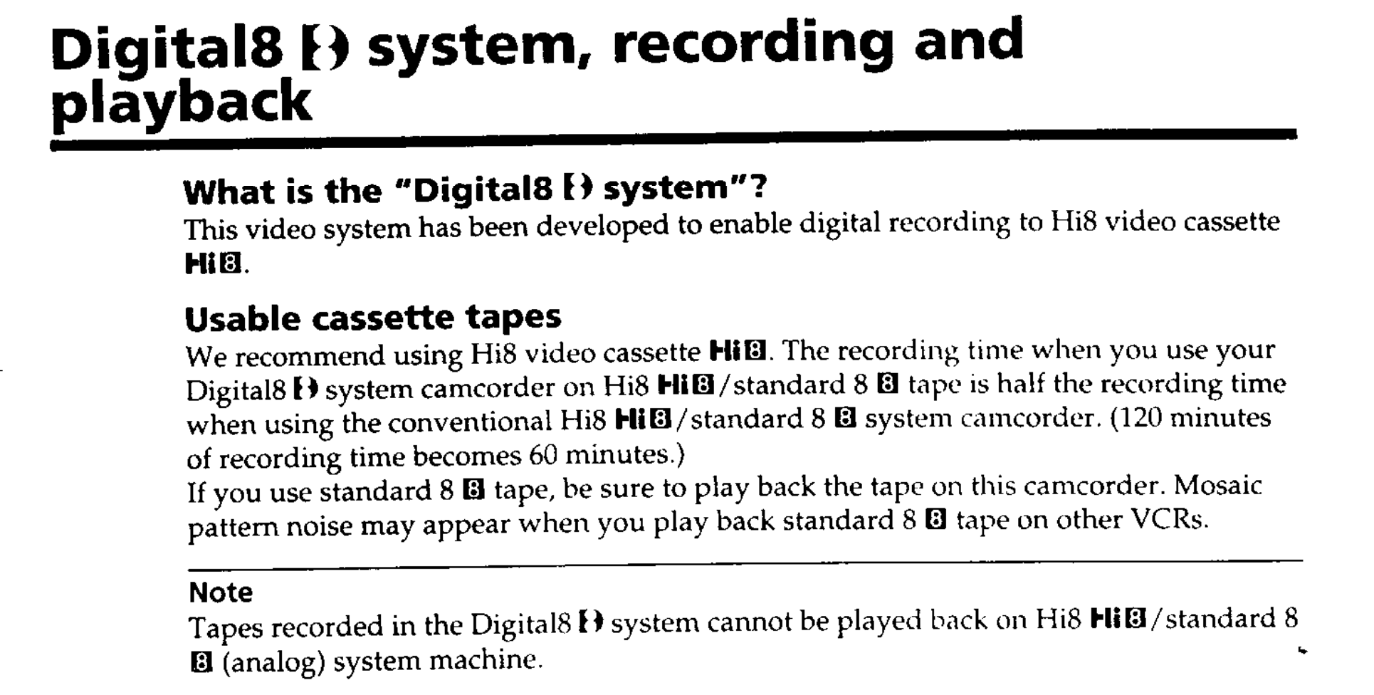 - There are three recording types: standard 8, Hi8 and Digital8.