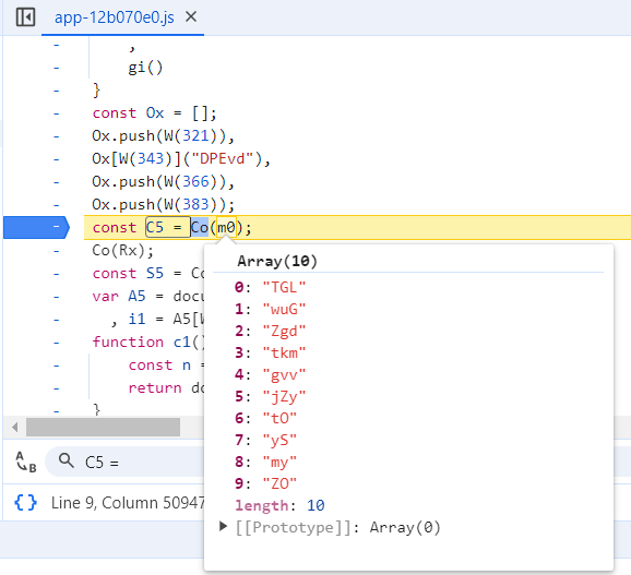 So "C5" is neither a variable created in the function, nor a received parameter. It means it's created somewhere outside the function in the JS file. That's good. Progress. Since it is a variable, that must mean it has to be assigned somewhere something. Click on the first line of the JS file and you can search the first appearance of "C5 = " since the js file is formatted (enable case-sensitive search). You can also place a debugger breakpoint on the line where you find something and refresh the page.Code:async function O5() { const n = W , t = { fcVHD: n(337), HtOev: function(x, r) { return x + r } }; try { const x = await fetch(i1, { method: t[n(326)], headers: { "Content-Type": n(339), "X-CSRF-TOKEN": c1() }, body: JSON.stringify({ amOJQwpfeNEMtHDipfKCfmshvqSZ: C5 }) });
