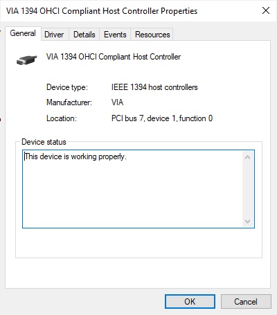 This is Device Manager for the firewire card after I changed the driver to VIA (though I don't know if it has a VIA chipset):