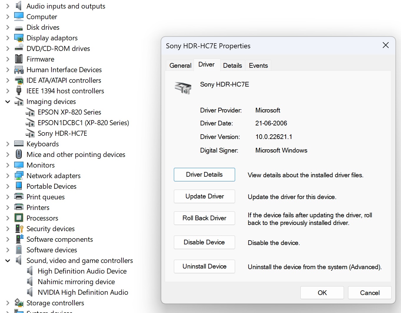 In Device Manager you should see this when your camera is plugged in and in DV mode (note my IEEE1394 entry is the native Win 11 Firewire setup with a VIA card; yours may be slightly different):