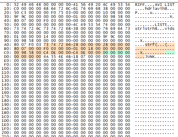 I'm not entirely sure how to find it. Is this it?Could you copy the contents of "00000000a4'strf' AVI Video Format " header here?