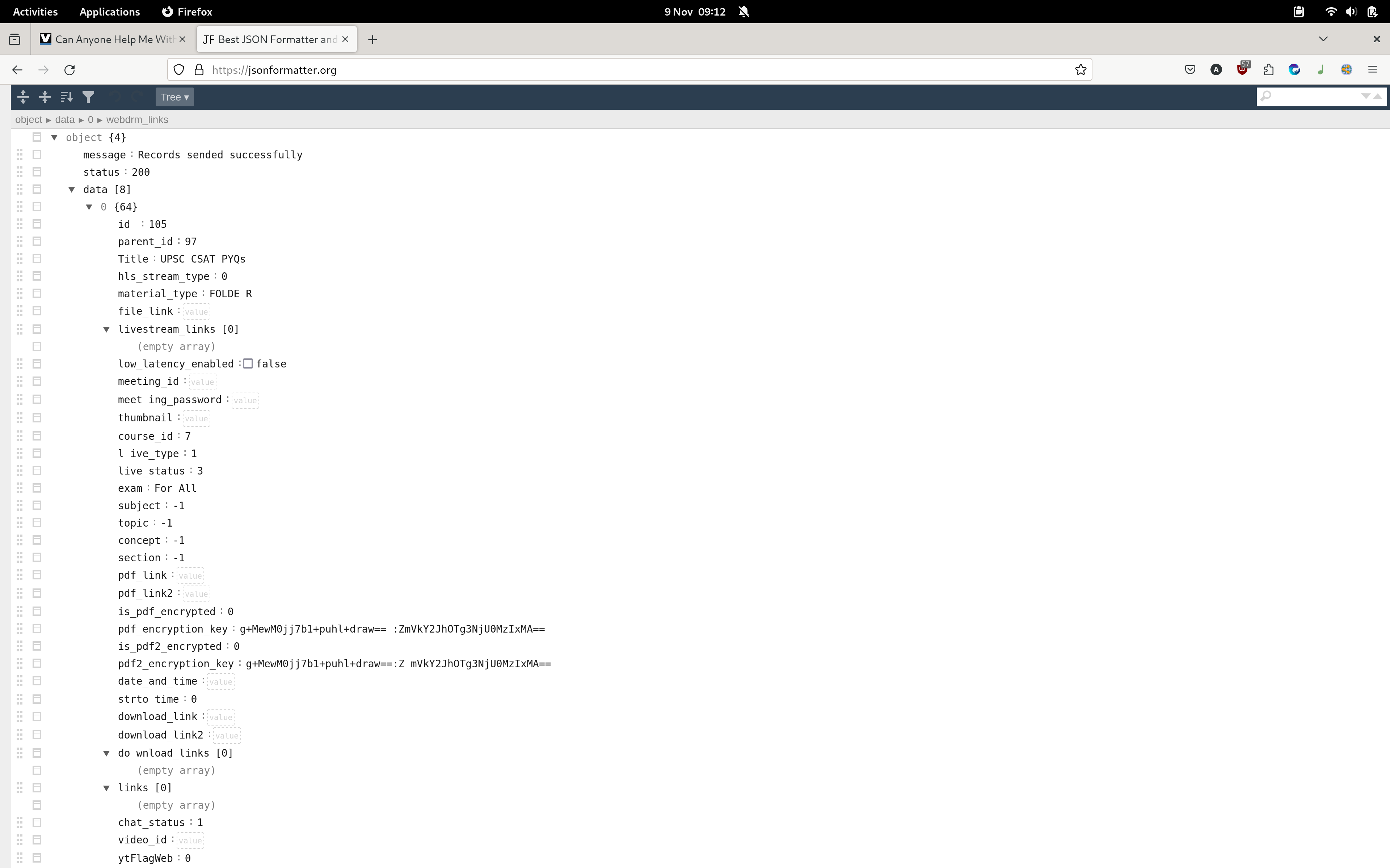 {"message":"Records sended successfully","status":200,"data":[{"id":"105","parent_id":"97","Title":"UPSC CSAT PYQs","hls_stream_type":"0","material_type":"FOLDE R","file_link":"","livestream_links":[],"low_latency_enabled":false,"meeting_id":"","meet ing_password":"","thumbnail":"","course_id":"7","l ive_type":"1","live_status":3,"exam":"For All","subject":-1,"topic":-1,"concept":-1,"section":-1,"pdf_link":"","pdf_link2":"","is_pdf_encrypted": "0","pdf_encryption_key":"g+MewM0jj7b1+puhl+draw== :ZmVkY2JhOTg3NjU0MzIxMA==","is_pdf2_encrypted":"0" ,"pdf2_encryption_key":"g+MewM0jj7b1+puhl+draw==:Z mVkY2JhOTg3NjU0MzIxMA==","date_and_time":"","strto time":0,"download_link":"","download_link2":"","do wnload_links":[],"links":[],"chat_status":"1","video_id":"","ytFlagWeb":0,"yt Flag":0,"app_status":"0","recording_schedule":null ,"recording_hls":"","media_id":"","free_flag":0,"o pen_outside_flag":"0","is_premiere":"0","filter":"-1","filter_name":"","special_course":null,"quiz_ti tle_id":"-1","live_quiz_id":-1,"save_flag":"1","sortingparam":"0.00","live_rewi nd_enable":"1","encrypted_links":[],"embed_url":"","videos_count":"0","files_count":" 19","tests_count":"0","images_count":"0","quiz_cou nt":"0","max_time_allowed":"","duration":"","curre nt_position":0,"is_purchased":"1","recording_type" :"0","video_key":"","webdrm_links":[]},{"id":"103","parent_id":"97","Title":"Live Class 1: Maths - Number System","hls_stream_type":"6","material_type":"VID EO","file_link":"YSwXFRFMlrUZThbKxczZm5XGiOJ8NNQsx j4QdeN37Bon9awqHjbwk7b\/NmyR3rCkctd1qI2bxxA+3mcyqLZ9+gn7b476bLpX8eedMX6jVy c2MJHaccsCHsUDpN7lS\/iFHP3iZ7LmXeI67cP0Jq5GNYkMfvEHqg+Bqj2BdM8obBo=:ZmV kY2JhOTg3NjU0MzIxMA==","livestream_links":[{"quality":"High Quality","path":"9ejsTS4YkiFw7JLA9CbHj+wrcSXugR+\/IH129UNTT3NvEaBm\/O96gMXrBTivhNrMvYZHmOI9\/ONKl1Wb9IqHMaITCFRfWOntSsGw2uzX2cAG6DWRi14STDz679d k9N\/OujiYEaXJFujpzeFbg\/mJe5mLOmm9yNVYJhzg9TMJGdTqM8KP\/Un7rxyuEPWPGFcvmjtE2ax1SCke1FDEO18zHQ==:ZmVkY2JhOT g3NjU0MzIxMA=="},{"quality":"Medium Quality","path":"9ejsTS4YkiFw7JLA9CbHj+wrcSXugR+\/IH129UNTT3NvEaBm\/O96gMXrBTivhNrMvYZHmOI9\/ONKl1Wb9IqHMaITCFRfWOntSsGw2uzX2cAG6DWRi14STDz679d k9N\/OujiYEaXJFujpzeFbg\/mJe5mLOmm9yNVYJhzg9TMJGdSUJlPk2wVbtoGK3bVmN3NawUz+ 4AFFIYGY+m2dOCkMGg==:ZmVkY2JhOTg3NjU0MzIxMA=="},{" quality":"Low Quality","path":"9ejsTS4YkiFw7JLA9CbHj+wrcSXugR+\/IH129UNTT3NvEaBm\/O96gMXrBTivhNrMvYZHmOI9\/ONKl1Wb9IqHMaITCFRfWOntSsGw2uzX2cAG6DWRi14STDz679d k9N\/OujiYEaXJFujpzeFbg\/mJe5mLOmm9yNVYJhzg9TMJGdRuGNAoczVnpYemIMGj3C7aSERJ 5Hmrfo85J90RQjEk+Q==:ZmVkY2JhOTg3NjU0MzIxMA=="}],"low_latency_enabled":true,"meeting_id":"","meeti ng_password":"","thumbnail":"https:\/\/d33g7sdvsfd029.cloudfront.net\/subject\/2023-10-06-0.46031459215725423.png","course_id":"7","live_typ e":"1","live_status":3,"exam":"For All","subject":-1,"topic":-1,"concept":-1,"section":-1,"pdf_link":"OPPxEhLYwCr2CtjATOZ+7yaZg\/eONT3D4jzpbdtikIVahFk4QKxgWvhWOXGwtATLIvY0kpvYA60C sHfwi\/yPkAGvql97LhDUVgnG7jHlD17jmVBG4Y3GnKK2v0qbfdUG:ZmV kY2JhOTg3NjU0MzIxMA==","pdf_link2":"","is_pdf_encr ypted":"0","pdf_encryption_key":"g+MewM0jj7b1+puhl +draw==:ZmVkY2JhOTg3NjU0MzIxMA==","is_pdf2_encrypt ed":"0","pdf2_encryption_key":"g+MewM0jj7b1+puhl+d raw==:ZmVkY2JhOTg3NjU0MzIxMA==","date_and_time":"0 8-10-2023 at 11:00 am","strtotime":1696743000,"download_link":"","dow nload_link2":"","download_links":[{"bitrate":"720p","quality":"720p","path":"YSwXFRF MlrUZThbKxczZm5XGiOJ8NNQsxj4QdeN37Bon9awqHjbwk7b\/NmyR3rCkctd1qI2bxxA+3mcyqLZ9+gn7b476bLpX8eedMX6jVy cniSquU1\/AgSBBpLlM+OuJ8zRIpAN71gAfi6ZwtICRpw==:ZmVkY2JhOTg3 NjU0MzIxMA==","backup_url":"YSwXFRFMlrUZThbKxczZm5 XGiOJ8NNQsxj4QdeN37Bon9awqHjbwk7b\/NmyR3rCkctd1qI2bxxA+3mcyqLZ9+gn7b476bLpX8eedMX6jVy cniSquU1\/AgSBBpLlM+OuJ8zRIpAN71gAfi6ZwtICRpw==:ZmVkY2JhOTg3 NjU0MzIxMA==","backup_url2":"YSwXFRFMlrUZThbKxczZm 5XGiOJ8NNQsxj4QdeN37Bon9awqHjbwk7b\/NmyR3rCkctd1qI2bxxA+3mcyqLZ9+gn7b476bLpX8eedMX6jVy cniSquU1\/AgSBBpLlM+OuJ8zRIpAN71gAfi6ZwtICRpw==:ZmVkY2JhOTg3 NjU0MzIxMA=="},{"bitrate":"480p","quality":"480p", "path":"YSwXFRFMlrUZThbKxczZm5XGiOJ8NNQsxj4QdeN37B on9awqHjbwk7b\/NmyR3rCkctd1qI2bxxA+3mcyqLZ9+ql4g+1X+fe3KLG0GKhmg0 WC2oktPBfM0yx46ay3dVeYg9NxshKh5Z7VqnYCnw8SnA==:ZmV kY2JhOTg3NjU0MzIxMA==","backup_url":"YSwXFRFMlrUZT hbKxczZm5XGiOJ8NNQsxj4QdeN37Bon9awqHjbwk7b\/NmyR3rCkctd1qI2bxxA+3mcyqLZ9+ql4g+1X+fe3KLG0GKhmg0 WC2oktPBfM0yx46ay3dVeYg9NxshKh5Z7VqnYCnw8SnA==:ZmV kY2JhOTg3NjU0MzIxMA==","backup_url2":"YSwXFRFMlrUZ ThbKxczZm5XGiOJ8NNQsxj4QdeN37Bon9awqHjbwk7b\/NmyR3rCkctd1qI2bxxA+3mcyqLZ9+ql4g+1X+fe3KLG0GKhmg0 WC2oktPBfM0yx46ay3dVeYg9NxshKh5Z7VqnYCnw8SnA==:ZmV kY2JhOTg3NjU0MzIxMA=="},{"bitrate":"360p","quality ":"360p","path":"YSwXFRFMlrUZThbKxczZm5XGiOJ8NNQsx j4QdeN37Bon9awqHjbwk7b\/NmyR3rCkctd1qI2bxxA+3mcyqLZ9+v3VG6SDUgBXZ1P\/Npn2MYvs9L7u1fc5kf6\/GM08P8rhxk3glUUAi9e9FFjZk3b81Q==:ZmVkY2JhOTg3NjU0M zIxMA==","backup_url":"YSwXFRFMlrUZThbKxczZm5XGiOJ 8NNQsxj4QdeN37Bon9awqHjbwk7b\/NmyR3rCkctd1qI2bxxA+3mcyqLZ9+v3VG6SDUgBXZ1P\/Npn2MYvs9L7u1fc5kf6\/GM08P8rhxk3glUUAi9e9FFjZk3b81Q==:ZmVkY2JhOTg3NjU0M zIxMA==","backup_url2":"YSwXFRFMlrUZThbKxczZm5XGiO J8NNQsxj4QdeN37Bon9awqHjbwk7b\/NmyR3rCkctd1qI2bxxA+3mcyqLZ9+v3VG6SDUgBXZ1P\/Npn2MYvs9L7u1fc5kf6\/GM08P8rhxk3glUUAi9e9FFjZk3b81Q==:ZmVkY2JhOTg3NjU0M zIxMA=="},{"bitrate":"240p","quality":"240p","path ":"YSwXFRFMlrUZThbKxczZm5XGiOJ8NNQsxj4QdeN37Bon9aw qHjbwk7b\/NmyR3rCkctd1qI2bxxA+3mcyqLZ9+s2aVu+szZzf\/q277rBVUbwucz\/AeWKJGY8dxjMOBOFg67xBMojHmLxVdME1eQYBfg==:ZmVkY2Jh OTg3NjU0MzIxMA==","backup_url":"YSwXFRFMlrUZThbKxc zZm5XGiOJ8NNQsxj4QdeN37Bon9awqHjbwk7b\/NmyR3rCkctd1qI2bxxA+3mcyqLZ9+s2aVu+szZzf\/q277rBVUbwucz\/AeWKJGY8dxjMOBOFg67xBMojHmLxVdME1eQYBfg==:ZmVkY2Jh OTg3NjU0MzIxMA==","backup_url2":"YSwXFRFMlrUZThbKx czZm5XGiOJ8NNQsxj4QdeN37Bon9awqHjbwk7b\/NmyR3rCkctd1qI2bxxA+3mcyqLZ9+s2aVu+szZzf\/q277rBVUbwucz\/AeWKJGY8dxjMOBOFg67xBMojHmLxVdME1eQYBfg==:ZmVkY2Jh OTg3NjU0MzIxMA=="},{"bitrate":"144p","quality":"14 4p","path":"YSwXFRFMlrUZThbKxczZm5XGiOJ8NNQsxj4Qde N37Bon9awqHjbwk7b\/NmyR3rCkctd1qI2bxxA+3mcyqLZ9+s2aVu+szZzf\/q277rBV