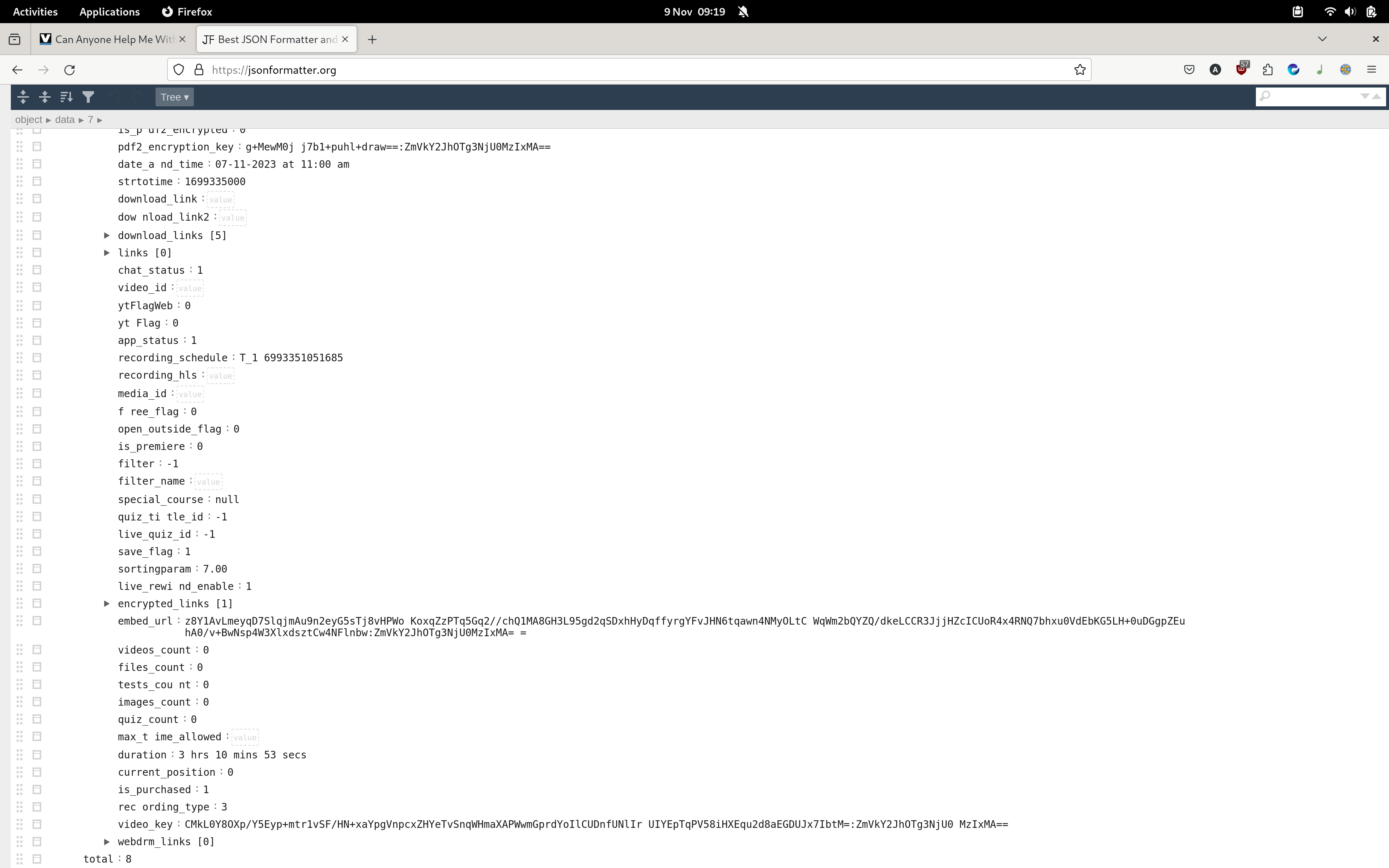 There are 8 data items in total (0-7) and the last one seems to contain the goodies. Looks to be encoded in base64 - with spaces added - but it doesn't decode (after spaces removed) so you'll need someone more capable than I for the decode operation. There is something at data 1 about pdf key is that involved in the encryption of the url?Last edited by A_n_g_e_l_a; 9th Nov 2023 at 04:07.