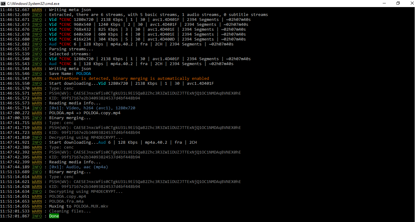 Code:N_m3u8DL-RE "http://du2yfy2plnh46.cloudfront.net/out/v1/e9a1f97c06ab462aa680cd0d044dcca7/8f1900706e91489c97d9bfa78cd54535/027a1ce70f5243389f55092171452030/index.mpd?aws.manifestfilter=audio_language%3Aeng%3Bvideo_codec%3Ah264%3Bvideo_height%3A1-720" --key 33bfe87a8a674027b88eef3dce49213a:8316a4d222b491d295bed577a16e2704 --check-segments-count false --no-log -M format=mkv 16:53:53.504 INFO : N_m3u8DL-RE (Beta version) 20241123 16:53:53.524 INFO : Loading URL: http://du2yfy2plnh46.cloudfront.net/out/v1/e9a1f97c06ab462aa680cd0d044dcca7/8f1900706e91489c97d9bfa78cd54535/027a1ce70f5243389f55092171452030/index.mpd?aws.manifestfilter=audio_language%3Aeng%3Bvideo_codec%3Ah264%3Bvideo_height%3A1-720 16:53:53.593 INFO : Content Matched: Dynamic Adaptive Streaming over HTTP 16:53:53.594 INFO : Parsing streams... 16:53:53.665 WARN : Writing meta json 16:53:53.669 INFO : New version detected! v0.3.0-beta 16:53:53.680 INFO : Extracted, there are 6 streams, with 5 basic streams, 1 audio streams, 0 subtitle streams 16:53:53.681 INFO : Vid *CENC 1280x720 | 2138 Kbps | 5 | 29.97 | avc1.64001F | 1467 Segments | ~01h37m52s 16:53:53.681 INFO : Vid *CENC 960x540 | 1240 Kbps | 4 | 29.97 | avc1.64001F | 1467 Segments | ~01h37m52s 16:53:53.681 INFO : Vid *CENC 768x432 | 825 Kbps | 3 | 29.97 | avc1.64001E | 1467 Segments | ~01h37m52s 16:53:53.682 INFO : Vid *CENC 640x360 | 600 Kbps | 2 | 29.97 | avc1.64001E | 1467 Segments | ~01h37m52s 16:53:53.682 INFO : Vid *CENC 416x234 | 304 Kbps | 1 | 29.97 | avc1.64000D | 1467 Segments | ~01h37m52s 16:53:53.682 INFO : Aud *CENC 6 | 127 Kbps | mp4a.40.2 | eng | 2CH | 1467 Segments | ~01h37m52s 16:54:01.352 INFO : Parsing streams... 16:54:01.358 INFO : Selected streams: 16:54:01.359 INFO : Vid *CENC 1280x720 | 2138 Kbps | 5 | 29.97 | avc1.64001F | 1467 Segments | ~01h37m52s 16:54:01.360 INFO : Aud *CENC 6 | 127 Kbps | mp4a.40.2 | eng | 2CH | 1467 Segments | ~01h37m52s 16:54:01.360 WARN : Writing meta json 16:54:01.367 INFO : Save Name: index_2025-07-19_16-53-53 16:54:01.367 WARN : MuxAfterDone is detected, binary merging is automatically enabled 16:54:01.368 INFO : Start downloading...Vid 1280x720 | 2138 Kbps | 5 | 29.97 | avc1.64001F 16:54:01.401 WARN : Type: cenc 16:54:01.402 WARN : PSSH(WV): CAESEDO/6HqKZ0AnuI7vPc5JIToaB2Zhc3R3ZWIiDUZJTTEyMDk4NS1NMDAqBVNEX0hE 16:54:01.404 WARN : KID: 33bfe87a8a674027b88eef3dce49213a 16:54:01.404 WARN : Reading media info... 16:54:01.440 INFO : [0x1]: Video, h264 (avc1), 1280x720 16:54:43.125 INFO : Binary merging... 16:54:45.761 WARN : Type: cenc 16:54:45.763 WARN : PSSH(WV): CAESEDO/6HqKZ0AnuI7vPc5JIToaB2Zhc3R3ZWIiDUZJTTEyMDk4NS1NMDAqBVNEX0hE 16:54:45.765 WARN : KID: 33bfe87a8a674027b88eef3dce49213a 16:54:45.863 INFO : Decrypting using FFMPEG... 16:55:03.417 INFO : Start downloading...Aud 6 | 127 Kbps | mp4a.40.2 | eng | 2CH 16:55:03.452 WARN : Type: cenc 16:55:03.453 WARN : PSSH(WV): CAESEDO/6HqKZ0AnuI7vPc5JIToaB2Zhc3R3ZWIiDUZJTTEyMDk4NS1NMDAqBVNEX0hE 16:55:03.454 WARN : KID: 33bfe87a8a674027b88eef3dce49213a 16:55:03.455 WARN : Reading media info... 16:55:03.493 INFO : [0x1]: Audio, aac (mp4a) 16:55:10.924 INFO : Binary merging... 16:55:11.243 WARN : Type: cenc 16:55:11.246 WARN : PSSH(WV): CAESEDO/6HqKZ0AnuI7vPc5JIToaB2Zhc3R3ZWIiDUZJTTEyMDk4NS1NMDAqBVNEX0hE 16:55:11.247 WARN : KID: 33bfe87a8a674027b88eef3dce49213a 16:55:11.248 INFO : Decrypting using FFMPEG... 16:55:16.459 WARN : index_2025-07-19_16-53-53.mp4 16:55:16.460 WARN : index_2025-07-19_16-53-53.eng.m4a 16:55:16.460 WARN : Muxing to index_2025-07-19_16-53-53.MUX.mkv 16:55:20.647 WARN : Cleaning files... 16:55:20.792 WARN : Rename to index_2025-07-19_16-53-53.mkv 16:55:21.061 INFO : Done