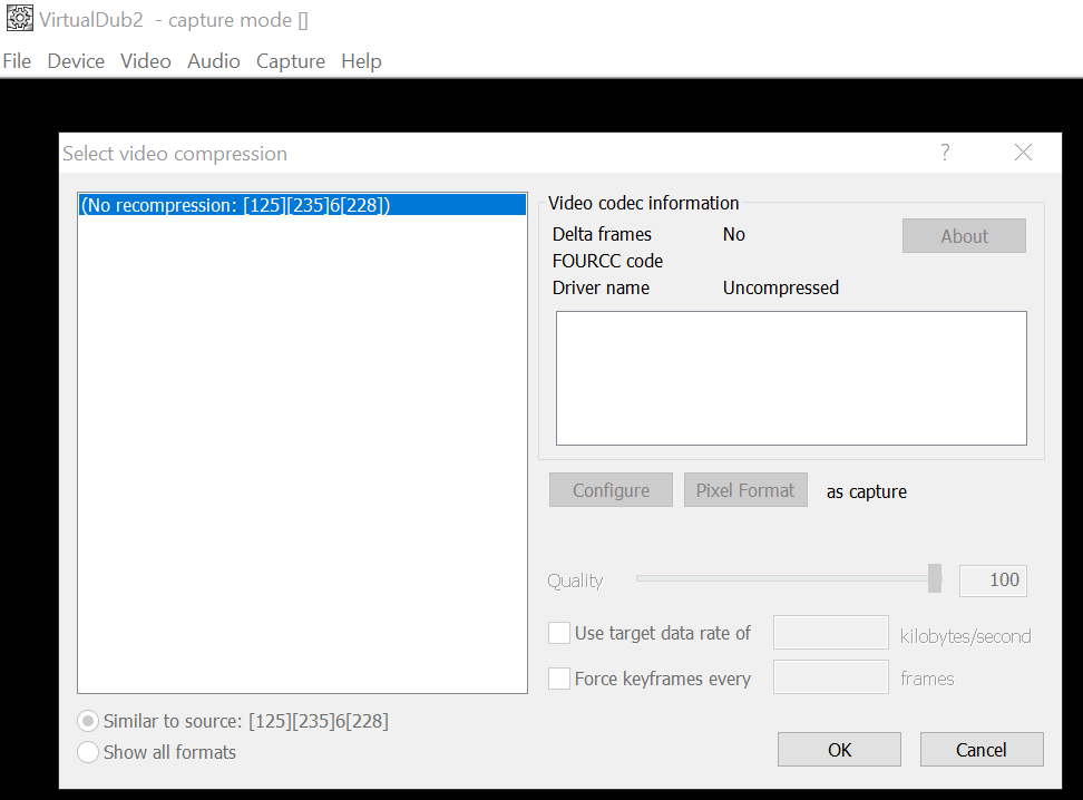 Does anyone happen to understand what's going on here? Seems like the device isn't playing nice with any codecs, and VirtualDub2 is not detecting any in the compression window.