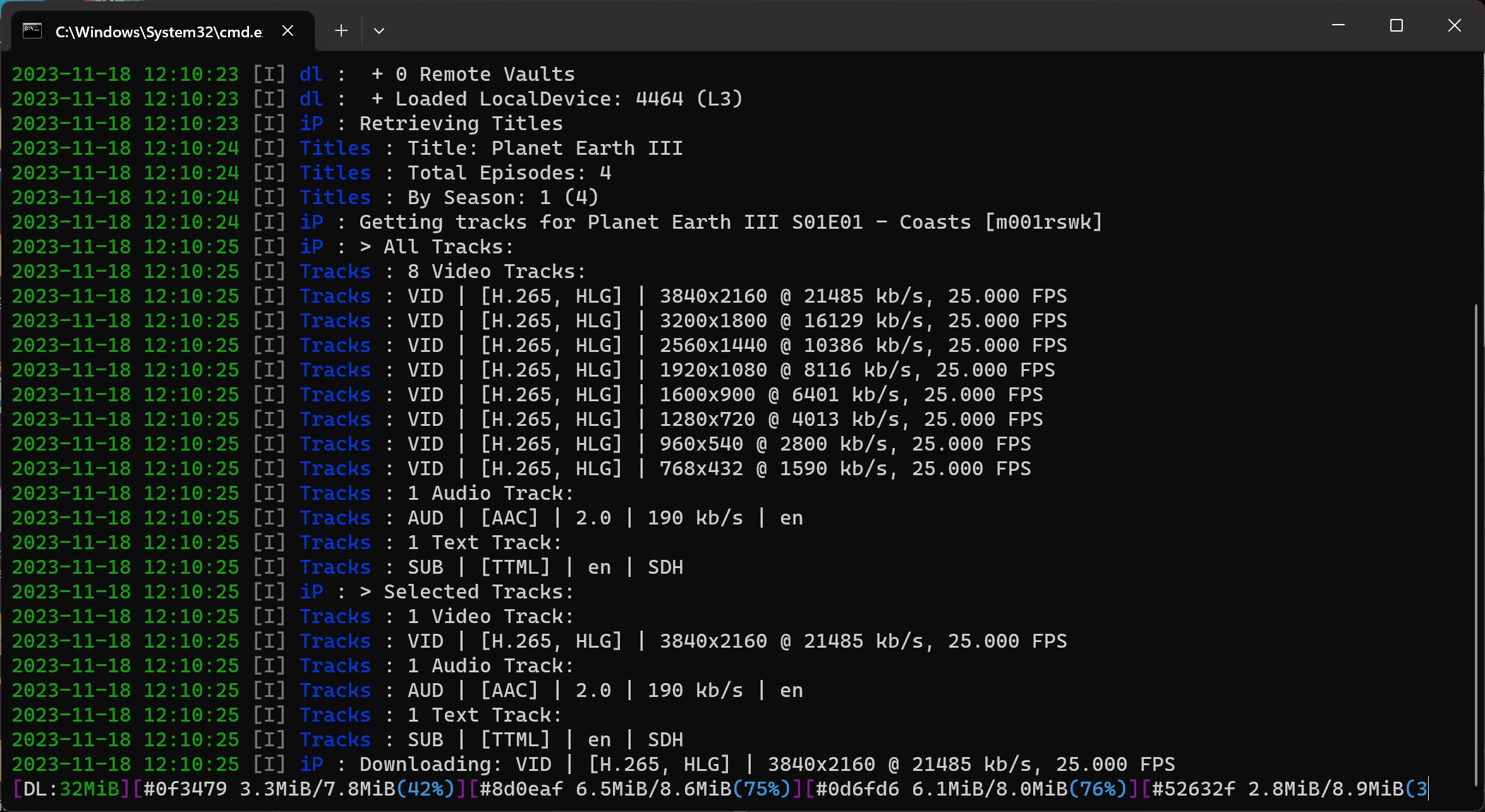2023-12-31 22:16:12 [I] download : + 1 Local Vaults 2023-12-31 22:16:12 [I] download : + 0 Remote Vaults 2023-12-31 22:16:12 [I] download : + Loaded LocalDevice: 4464 (L3) 2023-12-31 22:16:12 [I] iP : Creating a Python-requests Session 2023-12-31 22:16:12 [I] iP : + Set Common Headers 2023-12-31 22:16:12 [I] iP : + Set Cookies 2023-12-31 22:16:12 [I] iP : Obtaining a proxy to "gb" 2023-12-31 22:16:13 [I] iP : + Proxy was skipped as current region matches 2023-12-31 22:16:13 [I] iP : + Loaded [BBCiPlayer] Class instance 2023-12-31 22:16:13 [I] iP : Retrieving Titles 2023-12-31 22:16:13 [I] Titles : Title: Blue Planet II 2023-12-31 22:16:13 [I] Titles : Total Episodes: 8 2023-12-31 22:16:13 [I] Titles : By Season: 0 (1), 1 (7) 2023-12-31 22:16:13 [I] iP : Getting tracks for Blue Planet II S00E00 - Oceans of Wonder 2023-12-31 22:16:14 [I] iP : > All Tracks: 2023-12-31 22:16:14 [I] Tracks : 12 Video Tracks: 2023-12-31 22:16:14 [I] Tracks : VID | [avc1.64002A, SDR] | en | 1920x1080 @ 12000 kb/s, 50.000 FPS 2023-12-31 22:16:14 [I] Tracks : VID | [avc1.640020, SDR] | en | 1280x720 @ 5070 kb/s, 50.000 FPS 2023-12-31 22:16:14 [I] Tracks : VID | [avc1.64001F, SDR] | en | 960x540 @ 2812 kb/s, 50.000 FPS 2023-12-31 22:16:14 [I] Tracks : VID | [avc1.64001F, SDR] | en | 960x540 @ 1604 kb/s, 50.000 FPS