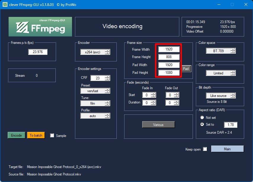 1) Load the original mkv video (1920x808), click main, click various, click fix timestamps, write in FPS field 23.976 and click fix.
