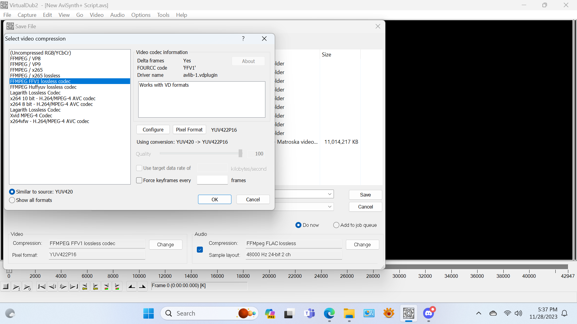 On the Save Video... screen, bottom left, set the video compression to one of the other codecs depending on what you want (eg lossless (HUFF, LAGS, UT video or lossy X264) and also change the Save As Type. If you use x264, you'll need to set the Audio Menu to Full Processing Mode and choose AAC or similar as the audio codec.Last edited by Alwyn; 28th Nov 2023 at 20:52.