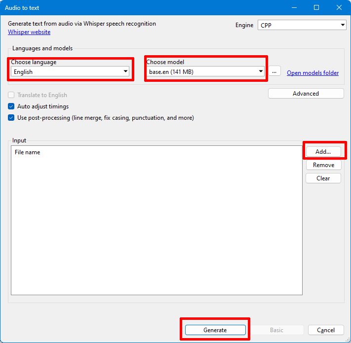 Select the video spoken language, download the related base model, set engine to CPP, add your video and click generate.