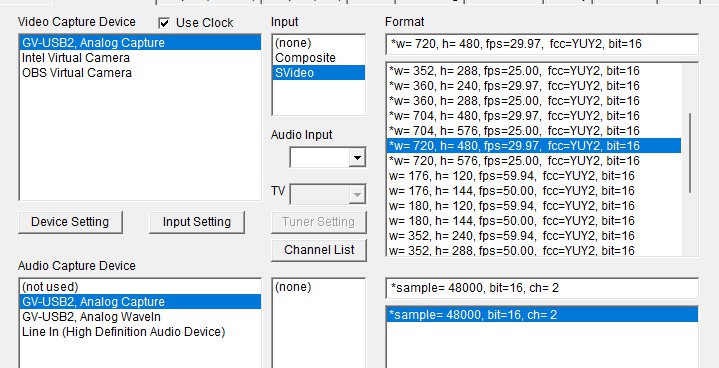 Choose the "*w= 720, h= 480, fps=29.97, fcc=YUY2, bit=16" format.