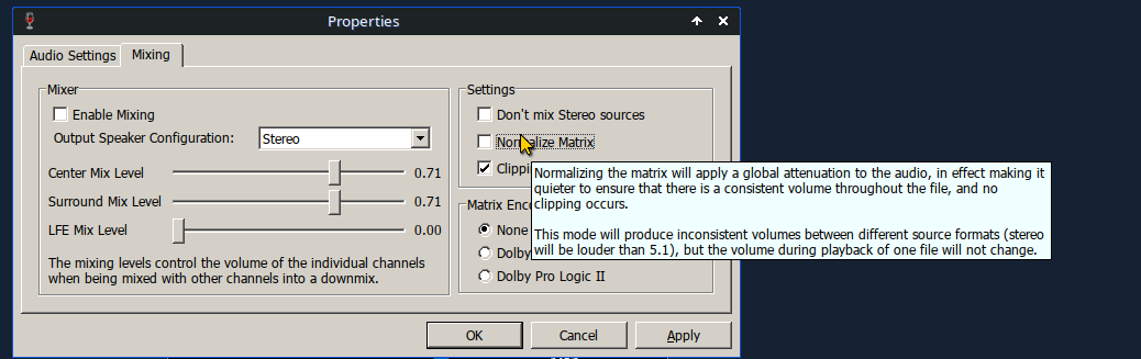 There's also a 7.1ch->2ch preset I created that you might want to try. It combines the left surround channels without changing the volume (same with the right), then runs the resulting 5.1ch through a limiter in case combining the surround channels caused clipping, and from there it downmixes the 5.1ch to stereo using a standard formula. I borrowed the idea from tebasuna51 at doom9. MeGUI uses his Avisynth script for downmixing 7.1ch to 2ch in much the same manner.Last edited by hello_hello; 14th Dec 2023 at 10:18.