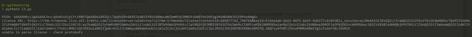 Thank you for your helpCode:import requests headers = { 'User-Agent': 'Mozilla/5.0 (Windows NT 10.0; Win64; x64; rv:120.0) Gecko/20100101 Firefox/120.0', 'Accept': '*/*', 'Accept-Language': 'fr-FR,fr;q=0.5', # 'Accept-Encoding': 'gzip, deflate, br', 'Referer': 'https://www.tv5mondeplus.com/', 'Origin': 'https://www.tv5mondeplus.com', 'Connection': 'keep-alive', 'Sec-Fetch-Dest': 'empty', 'Sec-Fetch-Mode': 'cors', 'Sec-Fetch-Site': 'cross-site', 'Content-Type': 'application/x-www-form-urlencoded', } params = { 'contentId': '105077742_74079A', 'keyId': 'fcbeeaab-da12-46f1-8a5f-9dd277cdc855', 'ls_session': 'eyJ0eXAiOiJKV1QiLCJraWQiOiI1OTkxYTkzOC0wMGMxLTQxMTItOGMwZC1hYmQ0YTdkNThjN2YiLCJhbGciOiJIUzI1NiJ9.eyJhaWQiOiJyYm0tdHY1bW9uZGUiLCJzdWIiOiJBTk9OWU1PVVMiLCJpYXQiOjE3MDI5NTA3OTUsImV4cCI6MTcwMjk1NDM5NSwianRpIjoicE1abzlKd08wa2M4OFJyOFNjOU1vcWVMOUwxc1B3ZzVXS0lxUHVQbjVYVT0iLCJlbnQiOlt7ImVwaWQiOiJzdHJlYW1pbmciLCJiaWQiOiJjaGFubmVsLTYxXzc0MDc5QSJ9XSwiaXNlIjp0cnVlLCJlbmNyeXB0aW9uUHJvZmlsZUlkIjoidHY1bW9uZGUiLCJpc3MiOiJUVjVNT05ERXBsdXMifQ.sBQFsy4fV8FzSVsxPMHRxRBmZYgluTo2eFt0ciVUhCE', } data = '^\b^\x04' response = requests.post( 'https://rbm-tv5monde.live.ott.irdeto.com/licenseServer/widevine/v1/rbm-tv5monde/license', params=params, headers=headers, data=data, )![]()