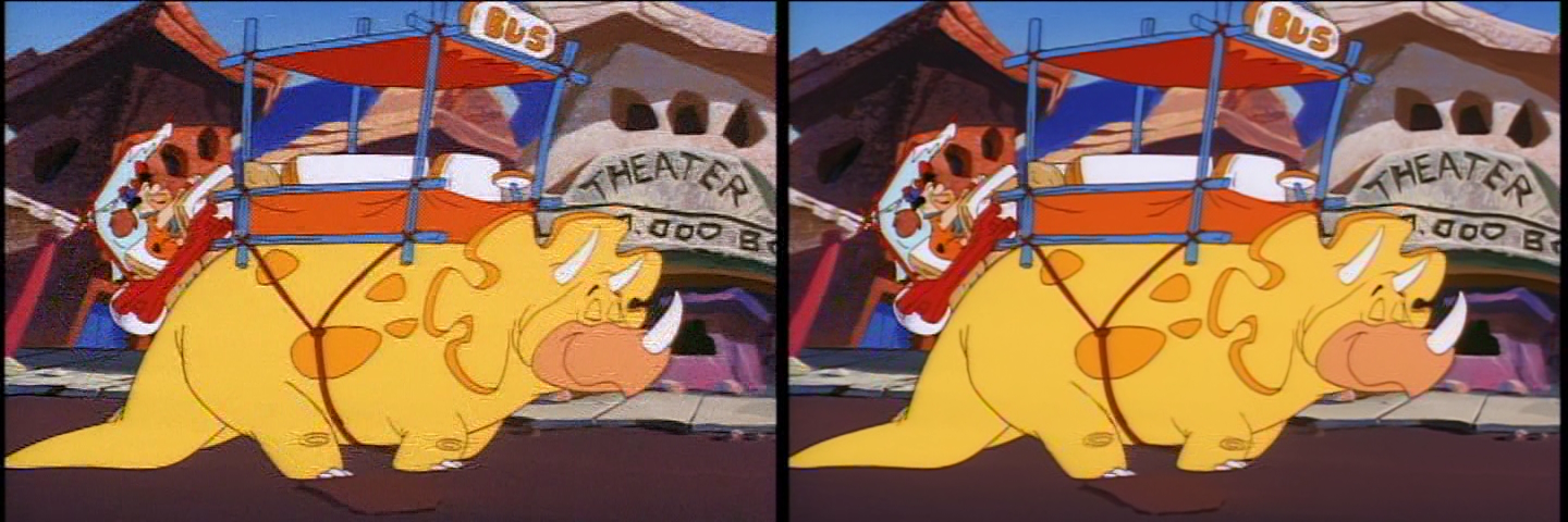 That's why I used the strong temporal noise reduction of SMDegrain. It cleans up most of those artifacts (as well as the other noise). Here's the same frame, before and after SMDegrain: