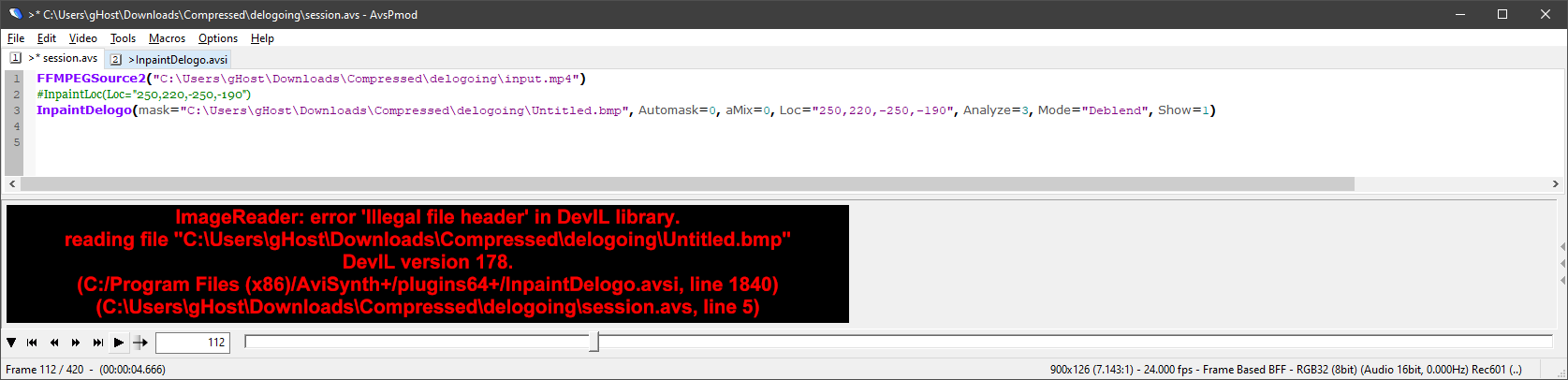 First time ever using InpaintDelogo, finally got it to work but now I am getting strange results for my bmp files.