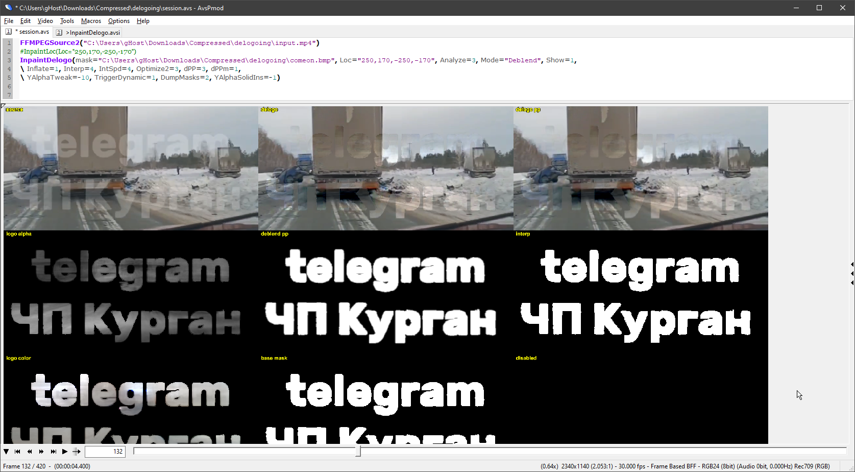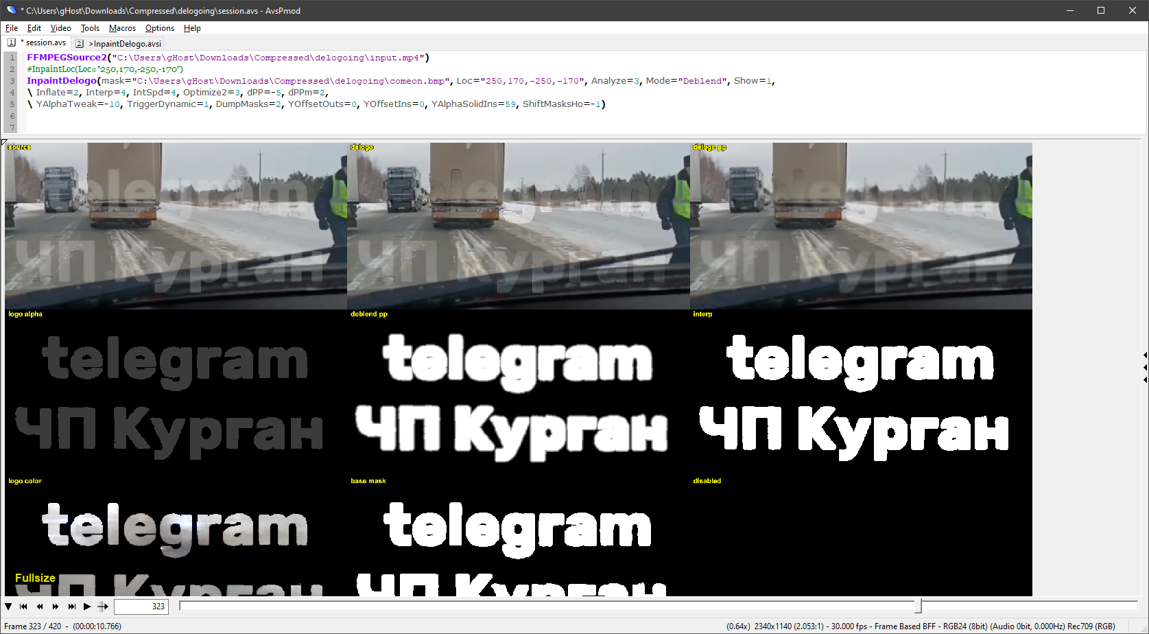 My original reason for trying out InpaintDelogo was to create a faster and better method of removing transparent logos because I already had a method of doing it that was pretty slow and finnicky. So I tried my older method, of using a .png of the watermark and then multiply it with the original video, and then screen with the watermark again, then merge it back with the original video with difference (I'm not really sure how it works but it usually give pretty good results after changing some of the "Blend" sliders for the merge nodes), and based on the results it rules out this compression making it impossible to deblend that I was talking about.