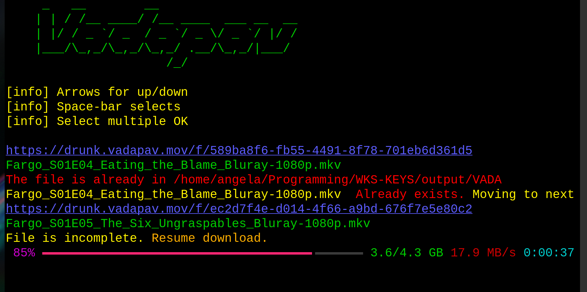 This downloader will resume the file from the progress point and give you the ability to set a series of downloads running. Speed at vadapav has improved of late by them adding a sub-domain to share the load. Choice of domains can be set by editing the script as can download path and save path see the top portion of the script for details.