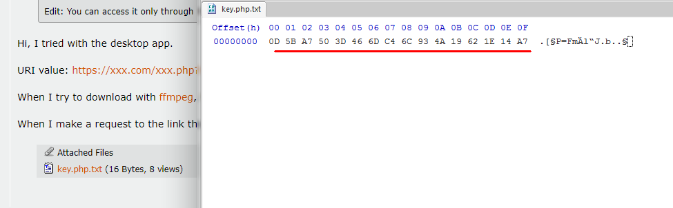 What difference will it make if I send the file, what will you do differently? Please don't misunderstand, I'm trying to understand.HTML Code:#EXTM3U #EXT-X-VERSION:3 #EXT-X-TARGETDURATION:13 #EXT-X-MEDIA-SEQUENCE:0 #EXT-X-KEY:METHOD=AES-128,URI="https://xxx.com/xxx.php?c=xxxxxxxxxxxxxxxxxxxxxxxxxxxxxxxx",IV=0x4d1acfe1962002a4abedb8b68c65fa93,KEYFORMATVERSIONS="1" #EXTINF:12.133, media_b595000_sl_0.ts #EXTINF:12.1, media_b595000_sl_1.ts #EXTINF:12.134,