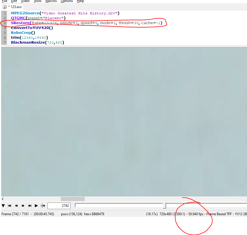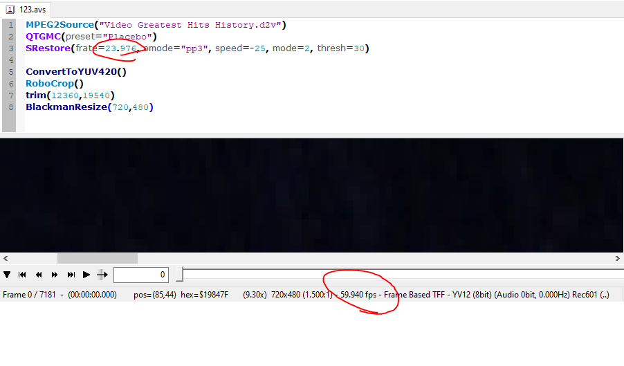 see: http://pastebin.com/raw/JYBjMBvxCode:om = default(omode, 6) bom = isstring(om) thr = abs(default(thresh, 16))+0.01 frfac = bom || abs(om-3)<2.5 ? 1 : isfloat(frate) ? frate*5<irate || frate>irate ? 1 : \ abs(frate)/irate : round(irate*10010)%30000==0 ? 1001./2400. : 480./1001.