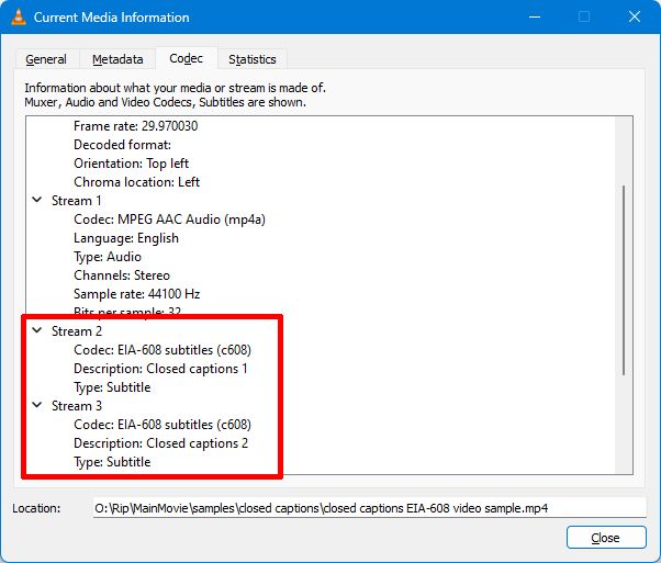 OK, I seem to be unable to find my original file that had the EIA 608 closed captioning. Seeing this post, I have a few questions: