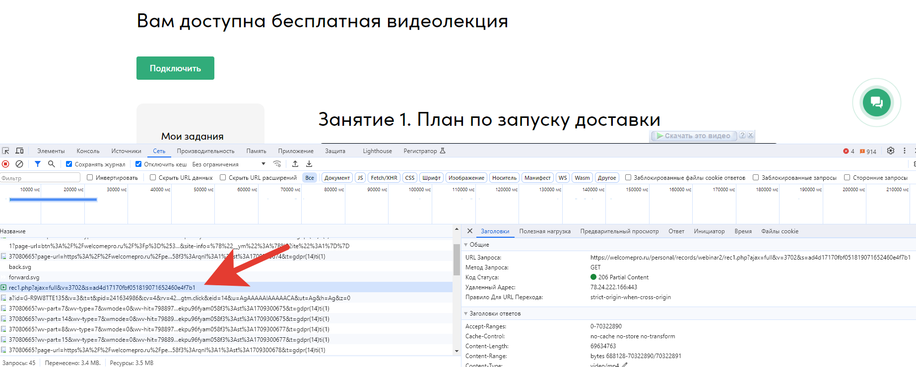 Code:curl "https://welcomepro.ru/personal/records/webinar2/rec1.php?ajax=full&v=3702&1" --output bla.mp4 ^ -H ^"cookie: PHPSESSID=4bWn6ISaNTCGZO1f91y078QZMspOA7qo; BITRIX_SMN_welcomepro.ru=12; BITRIX_SMN_PERS=1; BITRIX_SMN_NCC=Y; BITRIX_SMN_LOGIN=bmwclub2022^%^40yandex.ru; BITRIX_SMN_SOUND_LOGIN_PLAYED=Y; user_auth=true; hideCookiesWrap=true; _gr_session=^%^7B^%^22s_id^%^22^%^3A^%^228e33cc1d-7db5-4ec4-9db0-140ea0b08d35^%^22^%^2C^%^22s_time^%^22^%^3A1709305488170^%^7D^" ^ -H ^"referer: https://welcomepro.ru/personal/records/webinar2/bis.php?w=1292915^%^26ba=true^%^26z=3437879^%^26zad=3437892^" ^ -H "user-agent: Mozilla/5.0 (Windows NT 10.0; Win64; x64) AppleWebKit/537.36 (KHTML, like Gecko) Chrome/122.0.0.0 Safari/537.36"