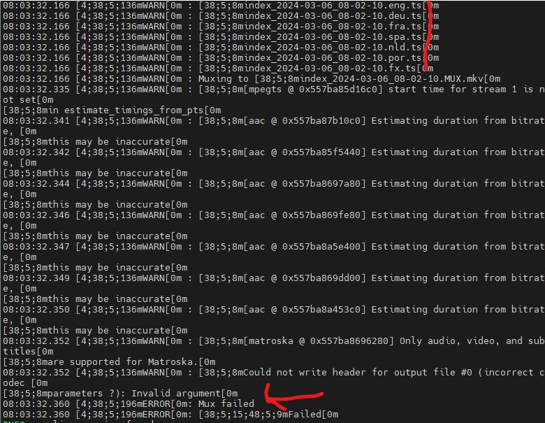 As I can see, mux process fails because audio extension is ".ts" and video as well.
