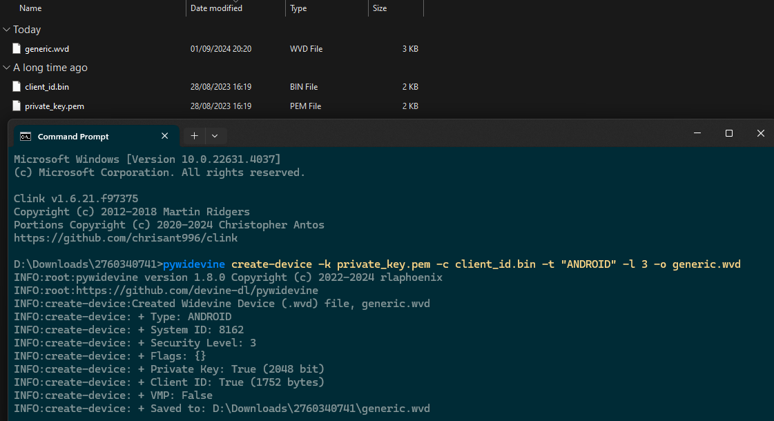 This is happening for all 30 of them:Code:$ pywidevine create-device -k private_key.pem -c client_id.bin -t ANDROID -l 3 -o . INFO:root:pywidevine version 1.8.0 Copyright (c) 2022-2024 rlaphoenix INFO:root:https://github.com/devine-dl/pywidevine Traceback (most recent call last): File "/home/dhinchak/code/drm/env/lib/python3.12/site-packages/pywidevine/device.py", line 113, in __init__ raise DecodeError("partial parse") google.protobuf.message.DecodeError: partial parse During handling of the above exception, another exception occurred: Traceback (most recent call last): File "/home/dhinchak/code/drm/env/bin/pywidevine", line 10, in <module> sys.exit(main()) ^^^^^^ File "/home/dhinchak/code/drm/env/lib/python3.12/site-packages/click/core.py", line 1157, in __call__ return self.main(*args, **kwargs) ^^^^^^^^^^^^^^^^^^^^^^^^^^ File "/home/dhinchak/code/drm/env/lib/python3.12/site-packages/click/core.py", line 1078, in main rv = self.invoke(ctx) ^^^^^^^^^^^^^^^^ File "/home/dhinchak/code/drm/env/lib/python3.12/site-packages/click/core.py", line 1688, in invoke return _process_result(sub_ctx.command.invoke(sub_ctx)) ^^^^^^^^^^^^^^^^^^^^^^^^^^^^^^^ File "/home/dhinchak/code/drm/env/lib/python3.12/site-packages/click/core.py", line 1434, in invoke return ctx.invoke(self.callback, **ctx.params) ^^^^^^^^^^^^^^^^^^^^^^^^^^^^^^^^^^^^^^^ File "/home/dhinchak/code/drm/env/lib/python3.12/site-packages/click/core.py", line 783, in invoke return __callback(*args, **kwargs) ^^^^^^^^^^^^^^^^^^^^^^^^^^^ File "/home/dhinchak/code/drm/env/lib/python3.12/site-packages/click/decorators.py", line 33, in new_func return f(get_current_context(), *args, **kwargs) ^^^^^^^^^^^^^^^^^^^^^^^^^^^^^^^^^^^^^^^^^ File "/home/dhinchak/code/drm/env/lib/python3.12/site-packages/pywidevine/main.py", line 197, in create_device device = Device( ^^^^^^^ File "/home/dhinchak/code/drm/env/lib/python3.12/site-packages/pywidevine/device.py", line 115, in __init__ raise DecodeError(f"Failed to parse client_id as a ClientIdentification, {e}") google.protobuf.message.DecodeError: Failed to parse client_id as a ClientIdentification, partial parse $