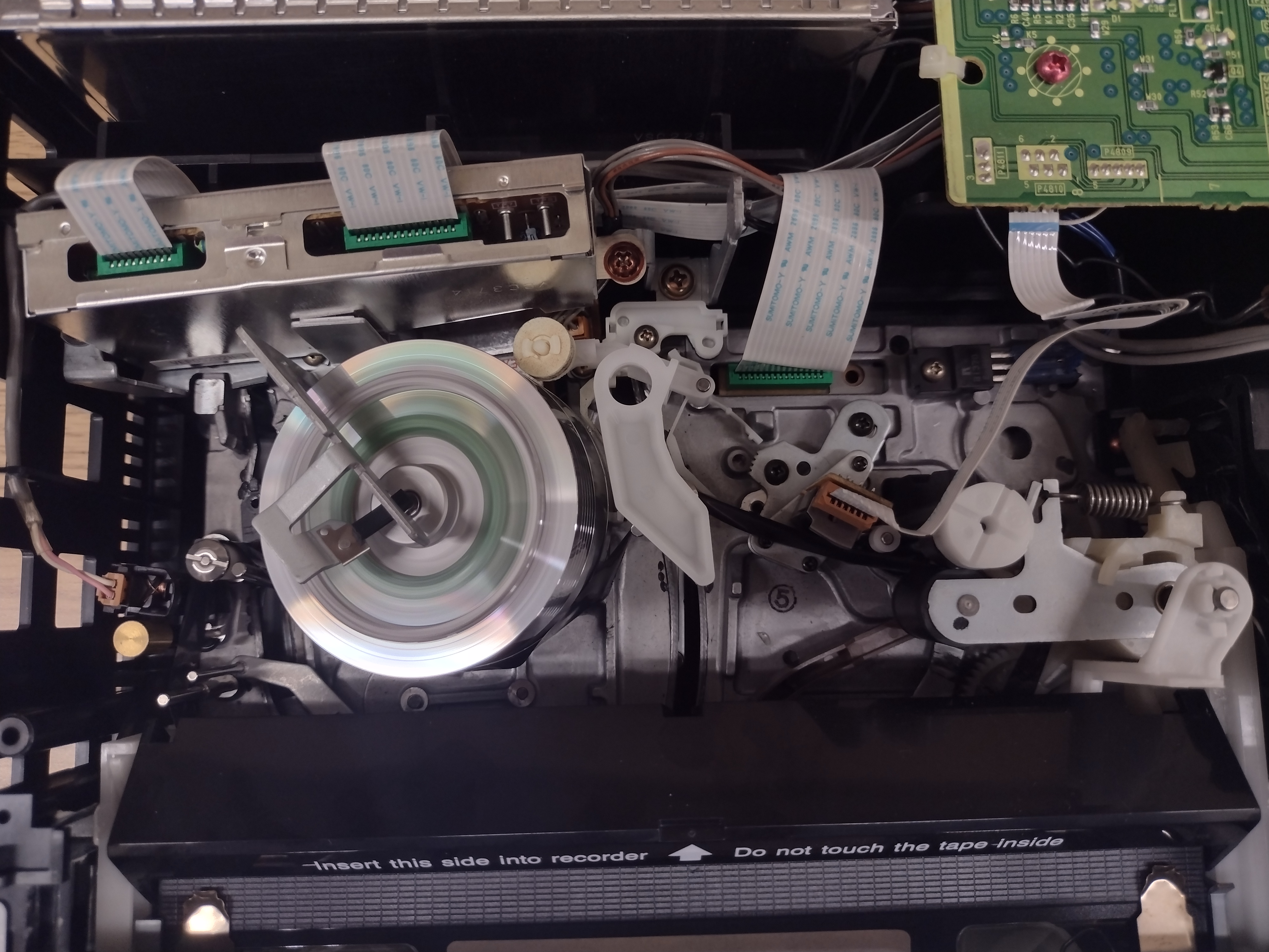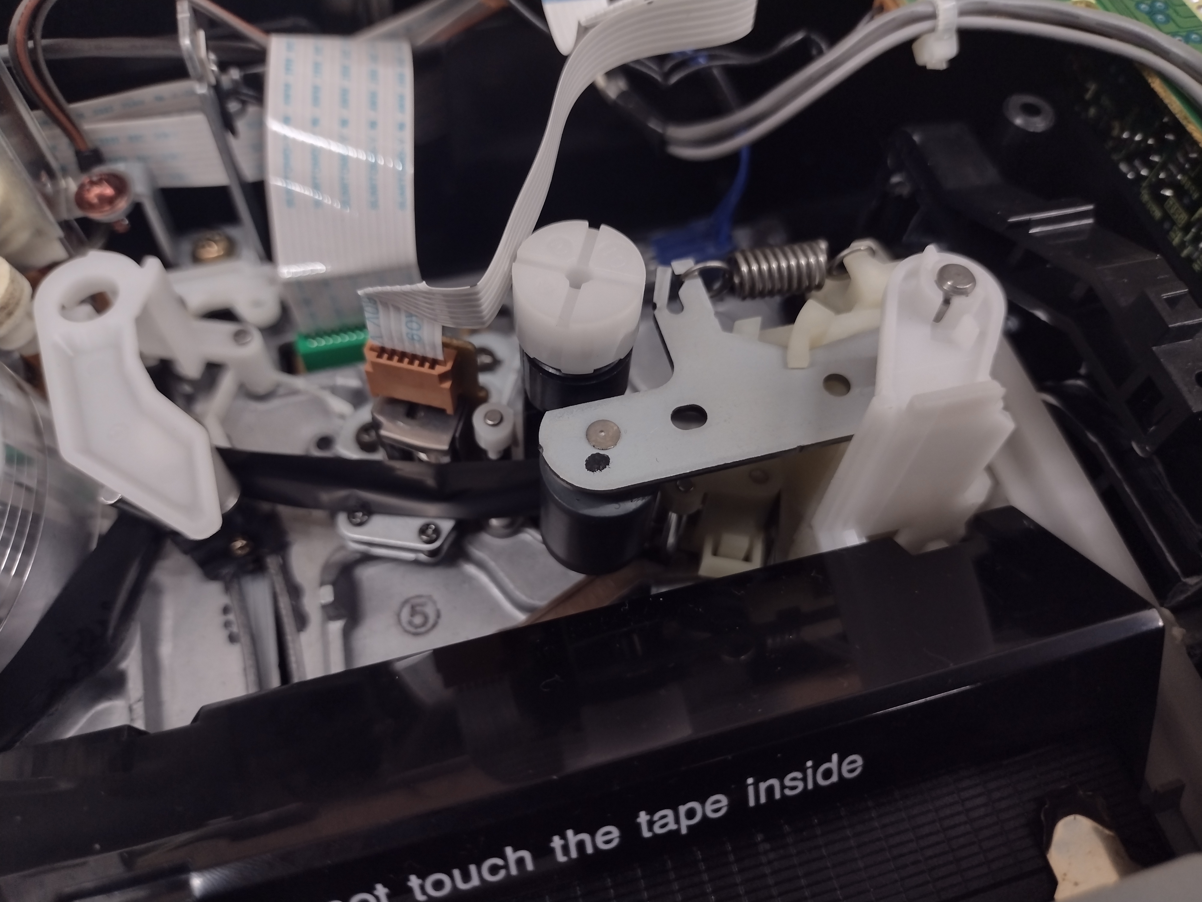 I've attached a few photos of the tape path, if that helps at all. I also have a copy of the service manual although it had no info on getting stuck tapes out. I unscrewed the top of the cassette carriage in the hopes that I might be able to disassemble it, but something there wasn't budging. Image