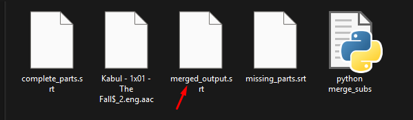 3. Place the two subs (.srt) file's (A; made with Se) (B;extracted foreign language from video file) in a folder with (python merge_subs.py) script ..encl as below