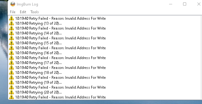 use good quality media such as Verbatium brand discs. see here for more info - https://forum.imgburn.com/topic/25337-invalid-address-for-write/ -