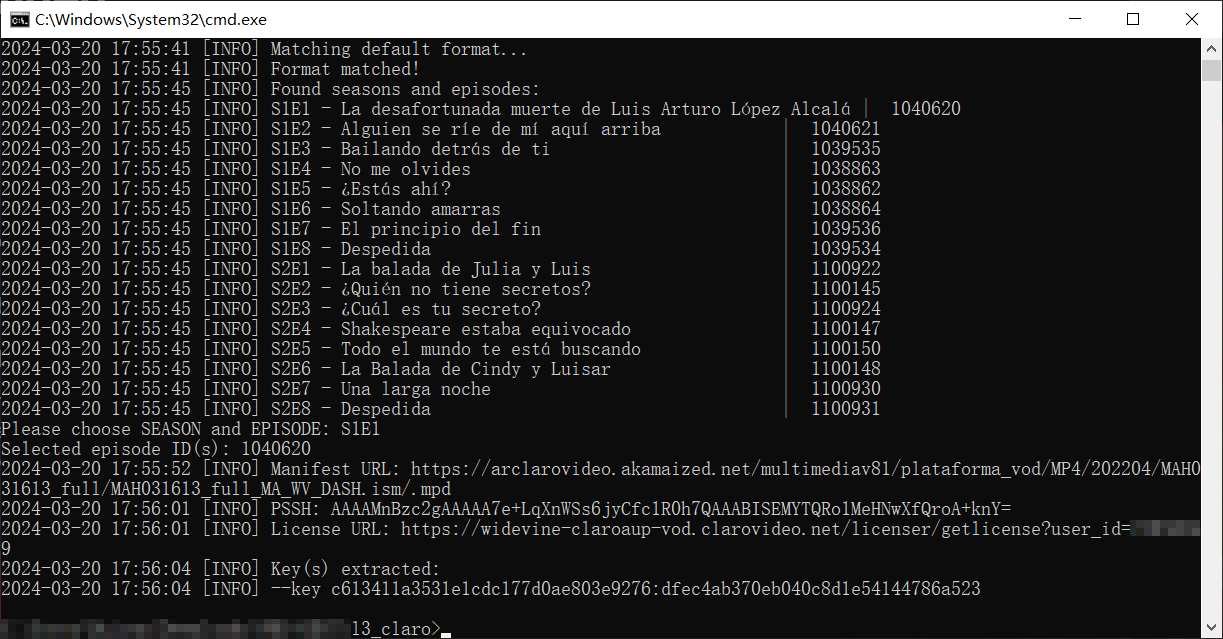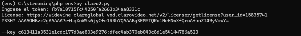 Code:from pywidevine.cdm import Cdm from pywidevine.device import Device from pywidevine.pssh import PSSH import requests import base64 DEVICE = r"C:\streaming\php env\WVD\google_widevine.wvd" def decrypt(token: str, lic_url: str, pssh: str) -> None: # Preparar PSSH pssh = PSSH(pssh) # Cargar el dispositivo device = Device.load(DEVICE) # Cargar CDM cdm = Cdm.from_device(device) # Abrir sesión CDM session_id = cdm.open() # Obtener el desafío de la licencia challenge = cdm.get_license_challenge(session_id, pssh) # Enviar el desafío de la licencia (suponiendo un servidor de licencias genérico sin API frontal) payload = { "token": token, "device_id": "693e9af84d3dfcc71e640e005bdc5e2e", "widevineBody": base64.b64encode(challenge).decode("utf-8"), } response = requests.post(lic_url, json=payload) response.raise_for_status() # Parsear el desafío de la licencia cdm.parse_license(session_id, response.content) # Imprimir claves for key in cdm.get_keys(session_id): if key.type == "CONTENT": print(f"\n--key {key.kid.hex}:{key.key.hex()}") # Cerrar sesión, libera los datos de la sesión cdm.close(session_id) def main(): # Obtener los valores de token, device_id y widevineBody desde el usuario token = input("Ingrese el token: ") lic_url = input("License: ") pssh = input("PSSH? ") decrypt(token, lic_url, pssh) if __name__ == "__main__": main()Code:Ingrese el token: 220b39f1fb49ff81d50dd20e35ae79ed License: https://widevine-claroglobal-vod.clarovideo.net/v2/licenser/getlicense?user_id=44065928 PSSH? AAAAR3Bzc2gAAAAA7e+LqXnWSs6jyCfc1R0h7QAAACcIARIQxhNBGjUx4c3Bd9CugD6SdhoDZGxhIgYzMjgyMDUqAlNEMgA= --key c613411a3531e1cdc177d0ae803e9276:dfec4ab370eb040c8d1e54144786a523