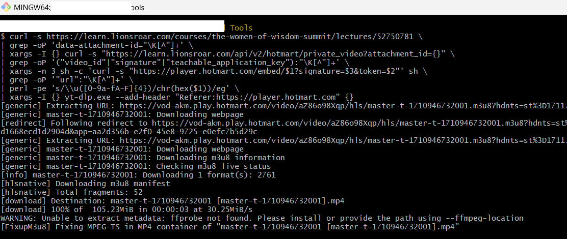 Output:Code:curl -s https://learn.lionsroar.com/courses/the-women-of-wisdom-summit/lectures/52750781 \ | grep -oP 'data-attachment-id="\K[^"]+' \ | xargs -I {} curl -s "https://learn.lionsroar.com/api/v2/hotmart/private_video?attachment_id={}" \ | grep -oP '("video_id"|"signature"|"teachable_application_key"):"\K[^"]+' \ | xargs -n 3 sh -c 'curl -s "https://player.hotmart.com/embed/$1?signature=$3&token=$2"' sh \ | grep -oP '"url":"\K[^"]+' \ | perl -pe 's/\\u([0-9a-fA-F]{4})/chr(hex($1))/eg' \ | xargs -I {} yt-dlp.exe --add-header "Referer:https://player.hotmart.com" {}