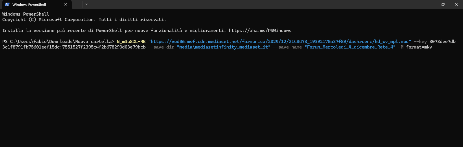 Will becomeCode:N_m3u8DL-RE "https://vod06.msf.cdn.mediaset.net/farmunica/2024/12/2148478_19392170a37f89/dashrcenc/hd_wv_mpl.mpd" --key 3073dee7db3c1f8791fb75601eef15dc:7551527f2395c4f2b678290d03e79bcb --save-dir "media\mediasetinfinity_mediaset_it" --save-name "Forum_Mercoledi_4_dicembre_Rete_4" -M format=mkv