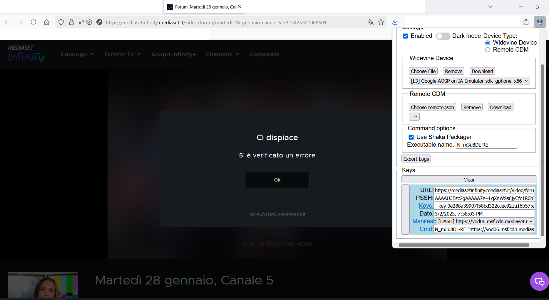 Code:ffplay -cenc_decryption_key 24ab3099e5304d210cf288ce31611908 "https://vod06.msf.cdn.mediaset.net/farmunica/2025/01/2177632_1946c6705d0f89/dashrcenc/hd_wv_mpl.mpd"