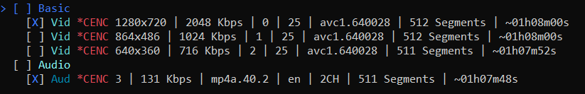 22:23:34.938 INFO : Vid *CENC 1280x720 | 2048 Kbps | 0 | 25 | avc1.640028 | 512 Segments | ~01h08m00s