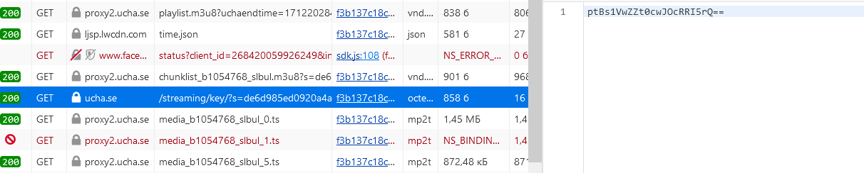 I got this lineand a request to this server give me :Code:#EXT-X-KEY:METHOD=AES-128,URI="https://ucha.se/streaming/key/?ut=wqeoBtn2Hu2dCAgn68H7"