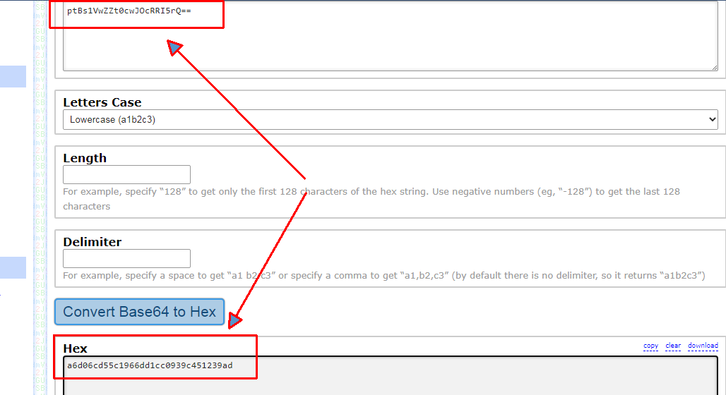 then convert base64 to hexCode:ptBs1VwZZt0cwJOcRRI5rQ==