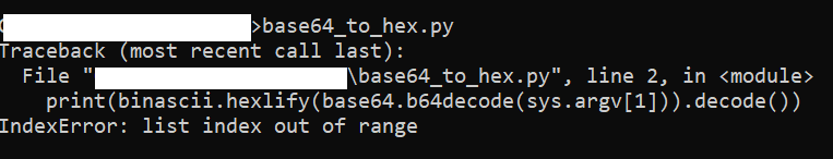 Code:import binascii, sys, base64 print(binascii.hexlify(base64.b64decode(sys.argv[1])).decode())