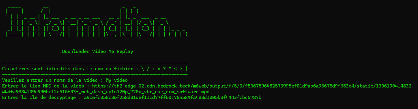 N_m3u8DL-RE -M format=mp4 "%MPD%" --key "%$Fichier%" --save-dir "./Downloads" --save-name "%Noms%"